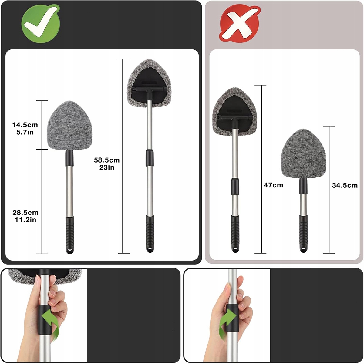 Телескопическая алюминиевая ручка стабильна и прочная, оставляя достаточно места, чтобы легко добраться до окна автомобиля. Длина ручки составляет от 34 см до 50 см, она безопасно закрыта, удалена и не совекает. Отличное дополнение в качестве бума для очистки внутреннего лобового стекла.