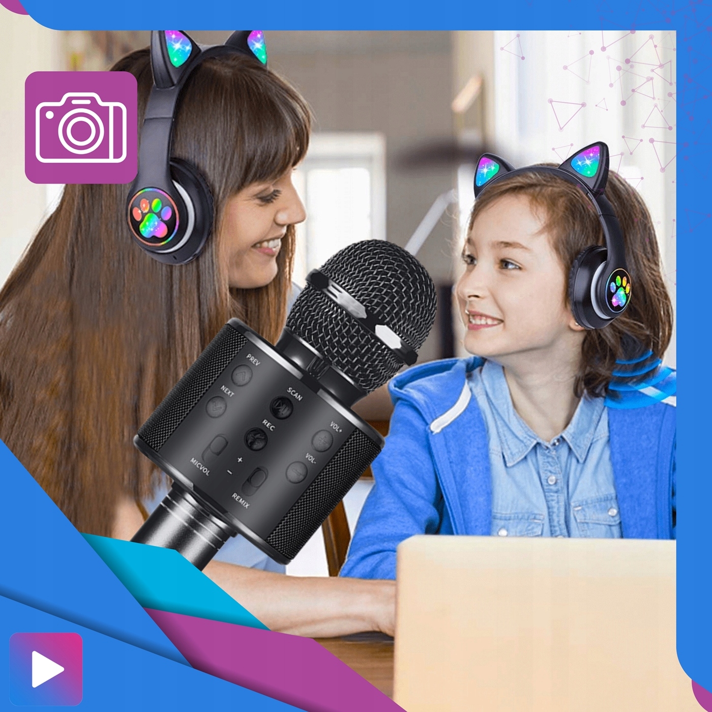 Mikrofon Asato Mikrofon Karaoke dla Dzieci RGB + Słuchawki bezprzewodowe nauszne Asato Kocie Uszy