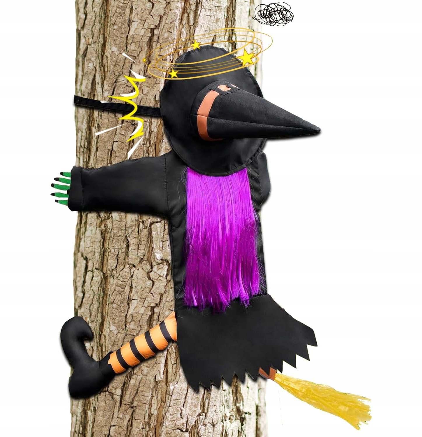 🎃 Интересный дизайн: он был разработан с черно-фиолетовой шляпой, фиолетовыми длинными волосами, зеленым руки, полосатые чулки и черные остроконечные туфли на ногах. Яркое, милое и веселое украшение в виде разбивающейся ведьмы привлечет внимание каждого, кто его увидит.