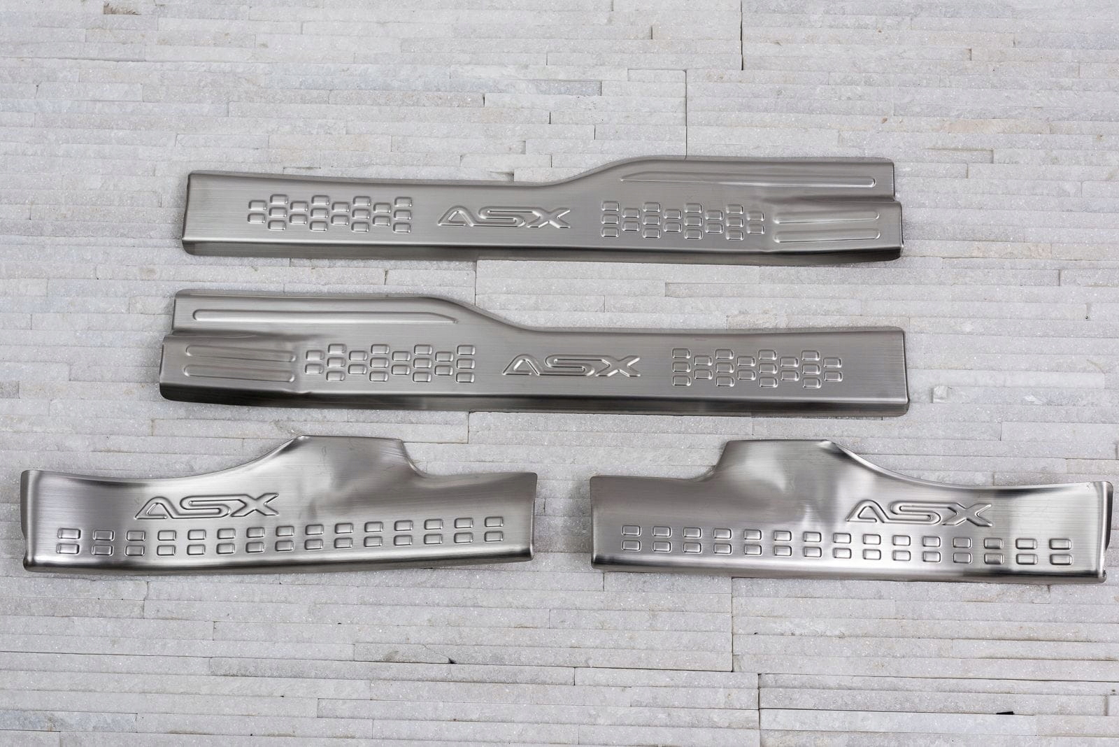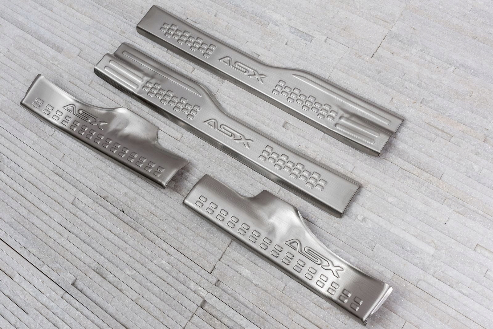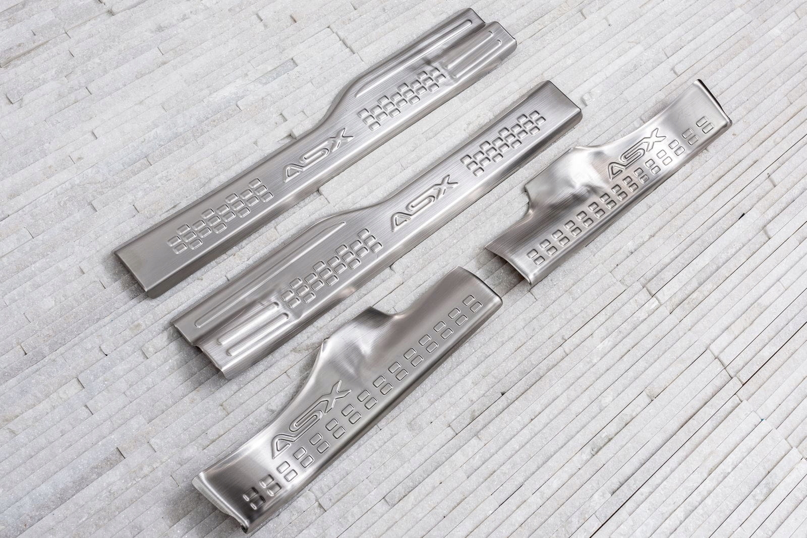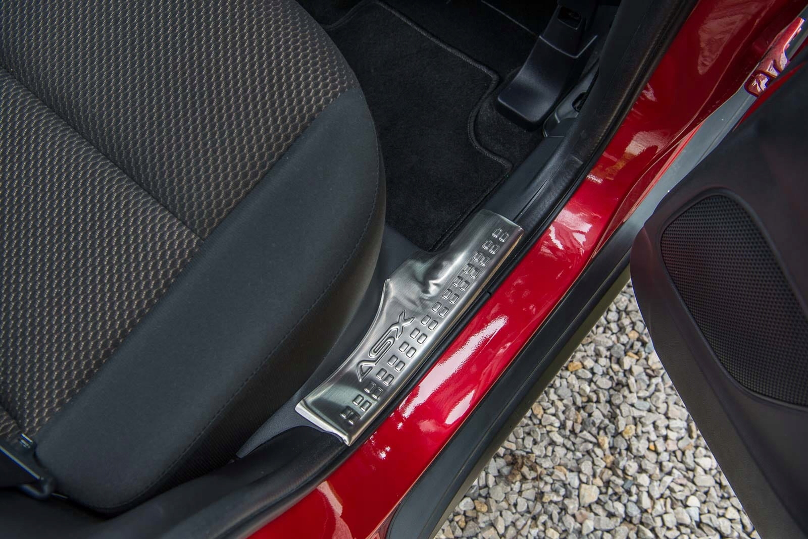 Полосы установлены на пластиковых частях внутренних порогов. Они дополняют внутреннюю линию двери, придают порогам спортивный вид. Эта модель привлекает внимание декоративным рисунком и надписью ASX, тисненной на каждом из плащников.