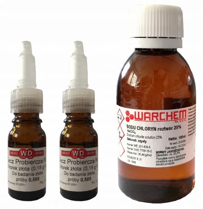 Жидкость изготовлена в соответствии со стандартом Польского комитета по стандартизации мер и качества, действующим во всех пробах. офисы. Для его изготовления использовались чистые для анализа химические соединения (о.а.), дистиллированная вода и золото пробы 0,9999. Хранится в плотной стеклянной бутылке с капельницей.