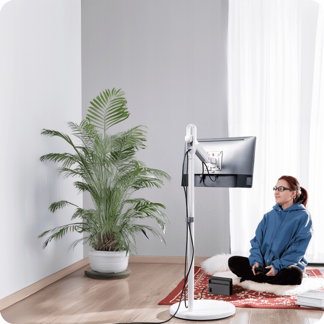 Держатель можно легко перемещать по дому. Ножка держателя оснащена колесиками, благодаря которым можно быстро переместить монитор в другое место.