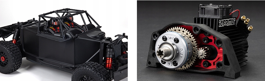 Динамический бесщеточный привод поддерживает батареи LiPo 4S. Он включает в себя водонепроницаемый регулятор Spektrum Firma 120A Smart, предназначенный для батарей 3S/4S, и бесщеточный двигатель Spektrum Firma 3668 2400Kv с редуктором Safe D, а также радиатор ARRMA и охлаждающий вентилятор.