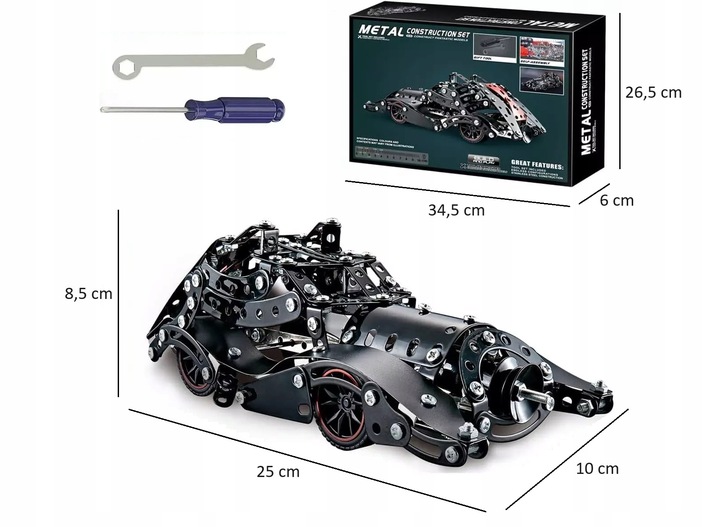 Набор был почти полностью создан из высококачественных металлических элементов . Единственным элементом набора, изготовленного из другого пластика, являются колеса - для их производства был использован резиновый пластик . Эта модель благодаря этому идеально подходит в качестве украшения офиса, дома или отдельной комнаты, а также как высококачественная игрушка для ребенка .