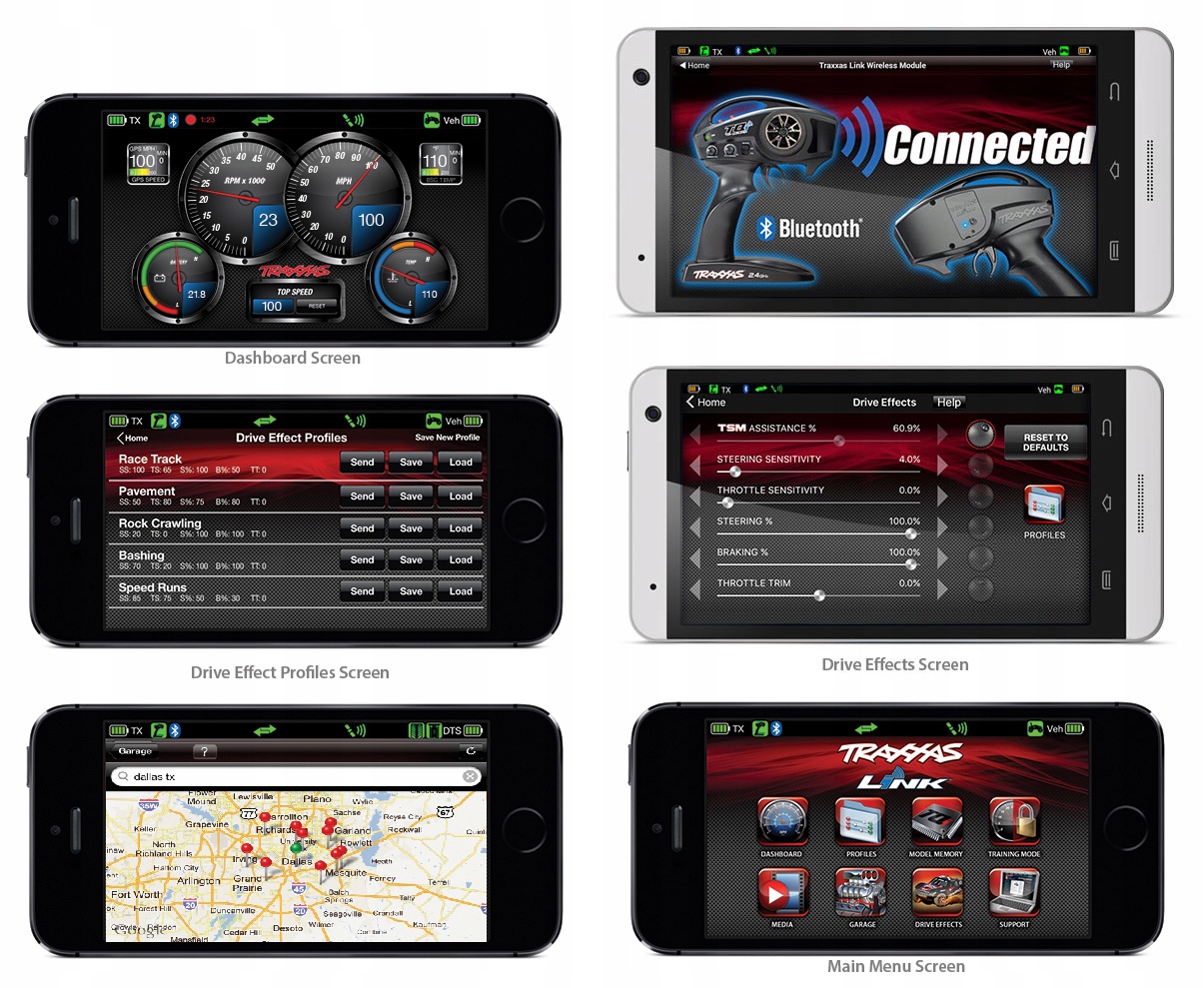 Самой важной новинкой этой системы является возможность работы с приложением Traxxas Link, доступным на Android и iOS. Это создает мощный инструмент настройки модели. Ваш смартфон подключается к системе LinkTraxxas™ и создает интуитивно понятный цветной графический пользовательский интерфейс высокого разрешения, который дает вам возможность оптимизировать вашу радиосистему для максимального контроля над автомобилем.