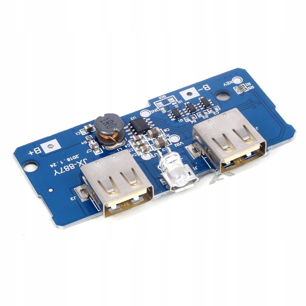 Модуль для построения повербанка со светодиодным индикатором разряда подключенного аккумулятора 18650. Имеет 2 порта USB, один из которых заряжается током 2,1А, другой - 1А. Напряжение зарядки составляет 5В. Имеет защиту от полной разрядки повербанка. Имеет защиту от перегрузки загружаемого предмета. Модуль обнаруживает подключенное устройство и автоматически начинает зарядку. Безопасная зарядка стабильным током