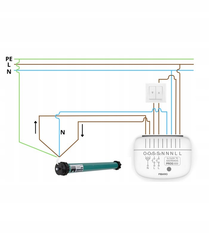 Благодаря модулю для управления двигателями из Фибары, вы можете управлять любым типом экранирования, который имеет возможность управлять настенным переключателем (у него две фазы). Это означает, что вы просто установите заданный модуль под переключателем, добавьте в блок управления z-волной и управление. Таким образом, вы можете подключиться: