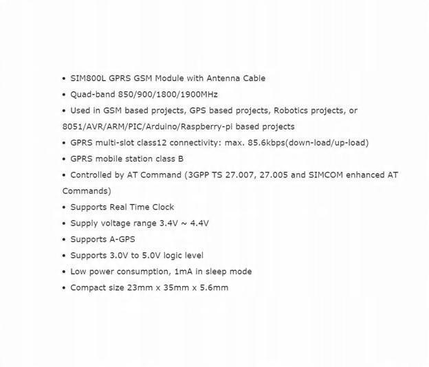 Комплект на базе GSM-модуля SIM800L, включающий плату SIM800L, 2 штыревых разъема, пружинную антенну, печатную плату 3G-антенны - кабель 15 см. Плата поддерживает микро-SIM-карту. Система работает на основе Quad Band и обеспечивает связь TX и RX на уровне TTL. На плате имеется светодиод, сигнализирующий о работе модуля.
