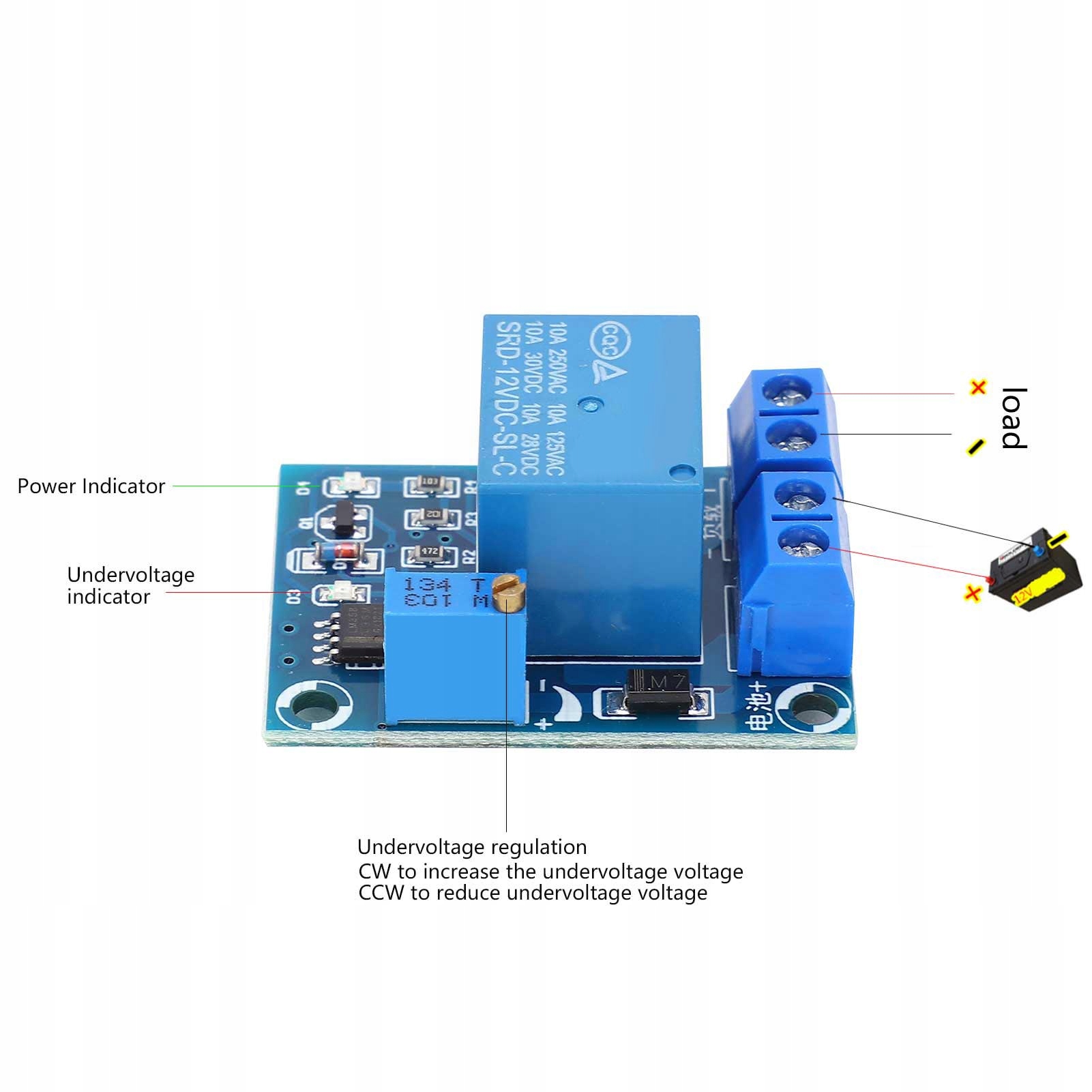1, потребляемая мощность этого модуля составляет менее 10 мА, низкое энергопотребление и длительный срок службы. 2. Значение защиты от пониженного напряжения по умолчанию составляет около 10,5 В, которое можно регулировать поворотом. потенциометр, увеличивающий по часовой стрелке и уменьшающий против часовой стрелки 3, если нагрузка восстанавливается сразу после отключения, можно добавить конденсатор (>25 В), емкость зависит от нагрузки 4. Это модуль переключателя минимального напряжения, используемый для отключения питания к резистивным нагрузкам, когда напряжение падает ниже определенного значения. 5. Когда напряжение увеличивается, модуль автоматически снова включает нагрузку, что упрощает эксплуатацию.