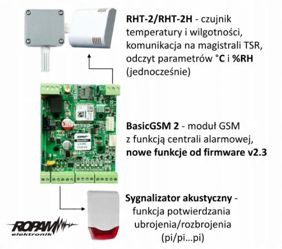 - поддержка датчика температуры серии TSR-x или датчика температуры и влажности RHT-2x (функция доступна с версии v2.3), GSM-термостата