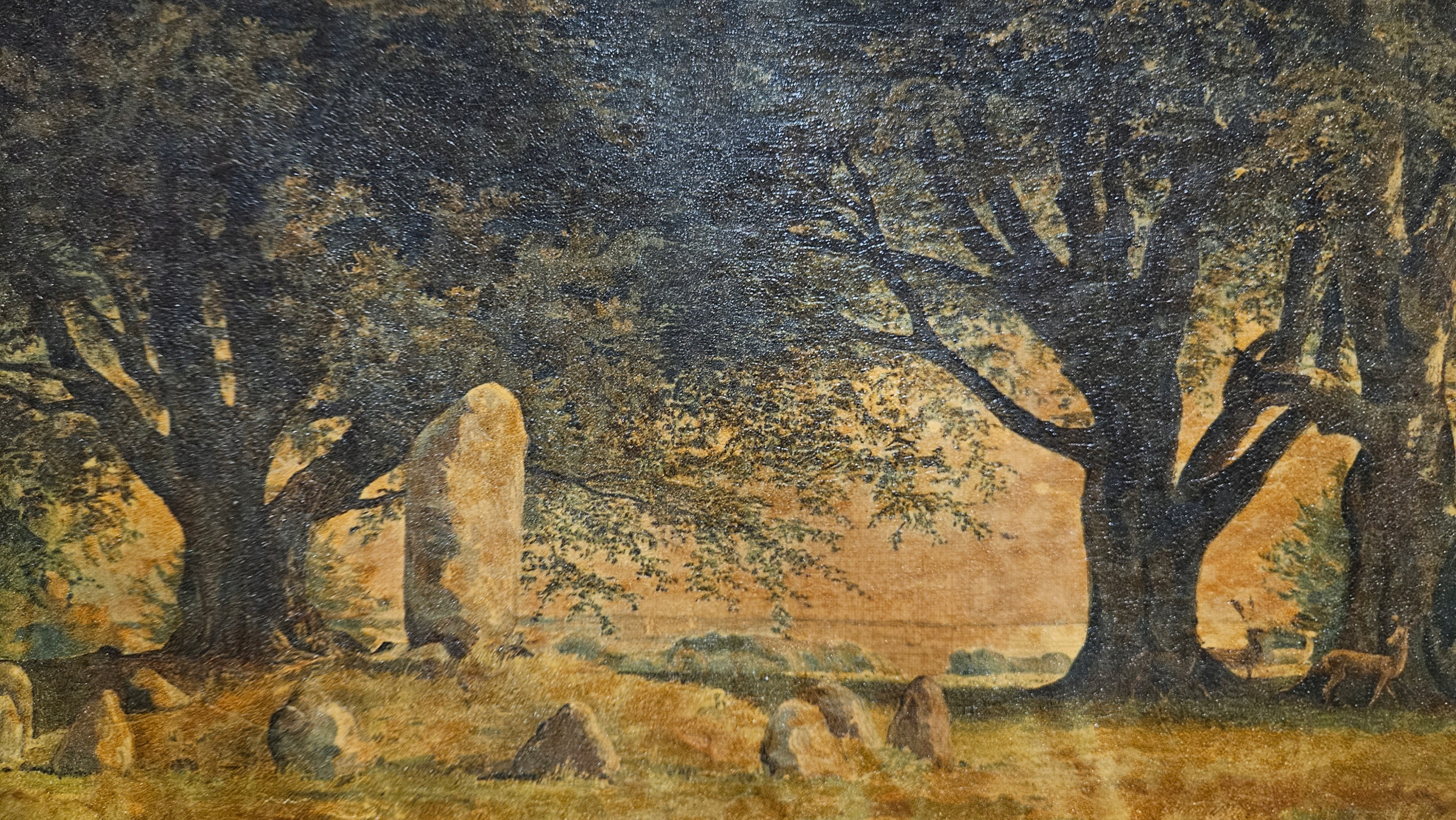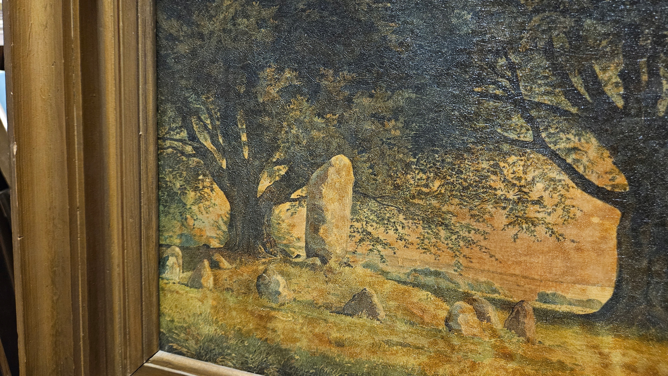 Оригинальное изображение нефти с изображением тихого пейзажа с монументальными деревьями, каменными валунами и тонким легким пронзительным через короны. Композиция сохраняется в теплом естественном тоне, который вводит атмосферу гармонии и мира.