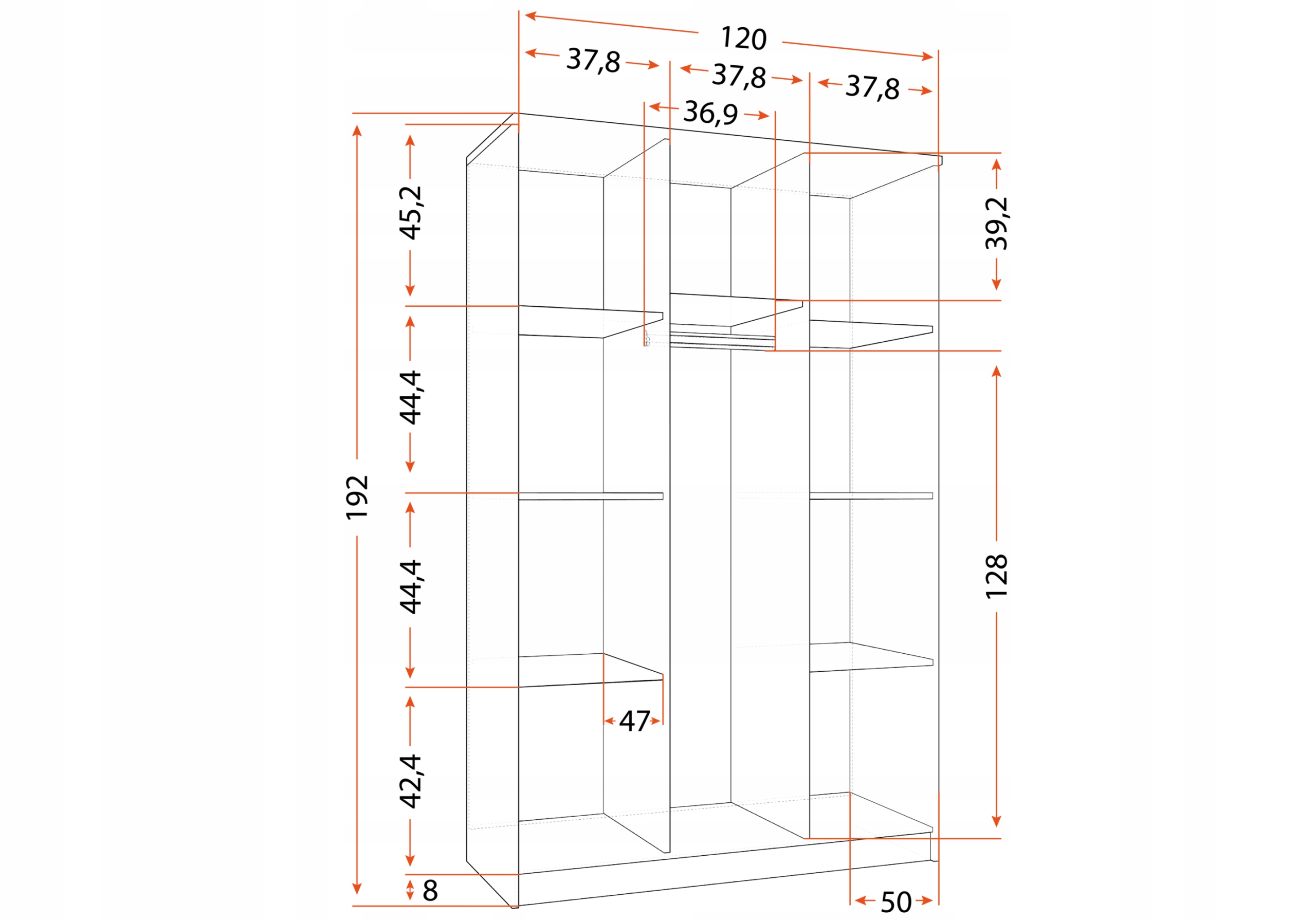 - Шкаф: 120 см (ширина) х 192 см (ширина) х 50 см (глубина)