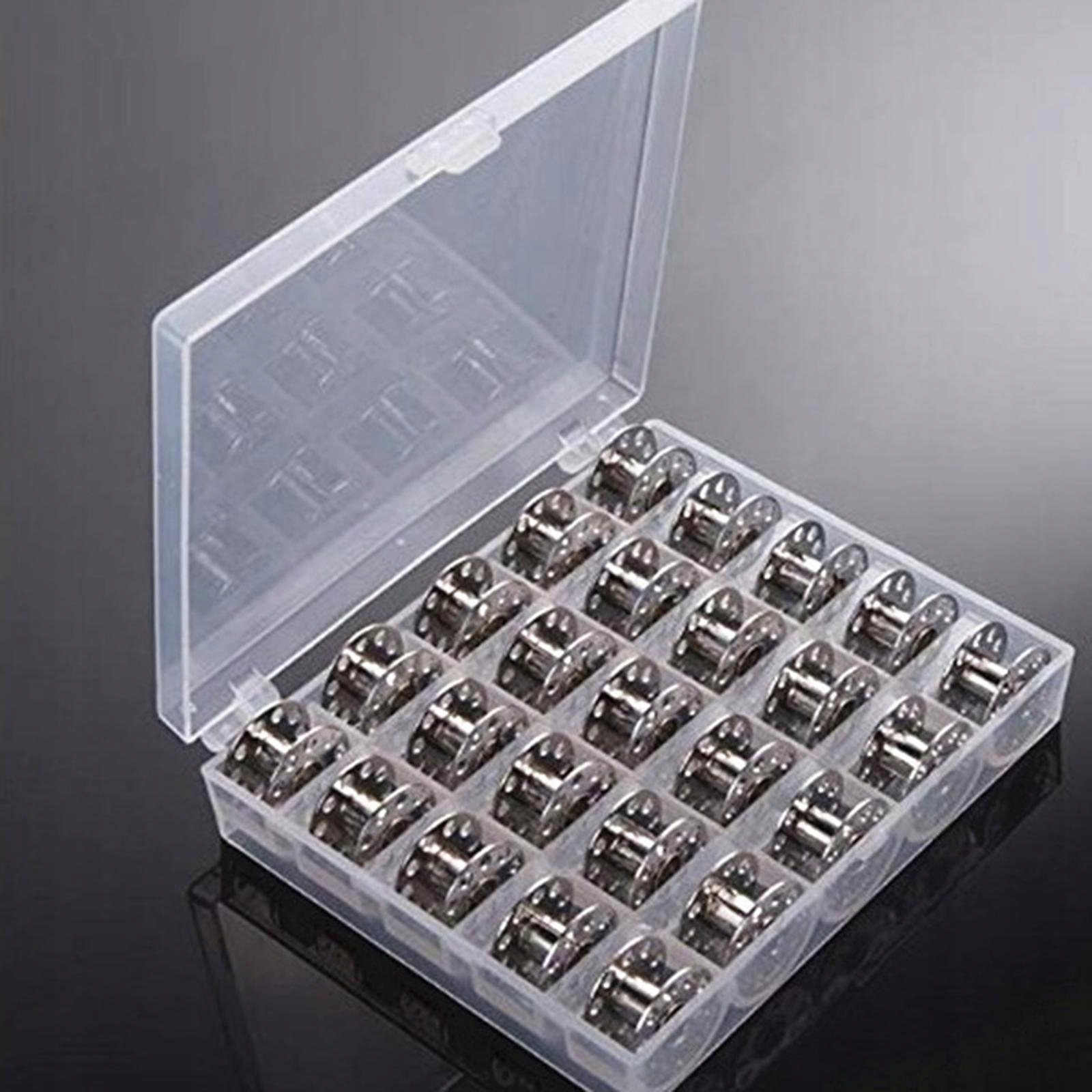 Набор из 25 металлических шпуль в коробке для швейных машин. Благодаря прозрачному корпусу вы легко найдете нужный вам цвет ниток.