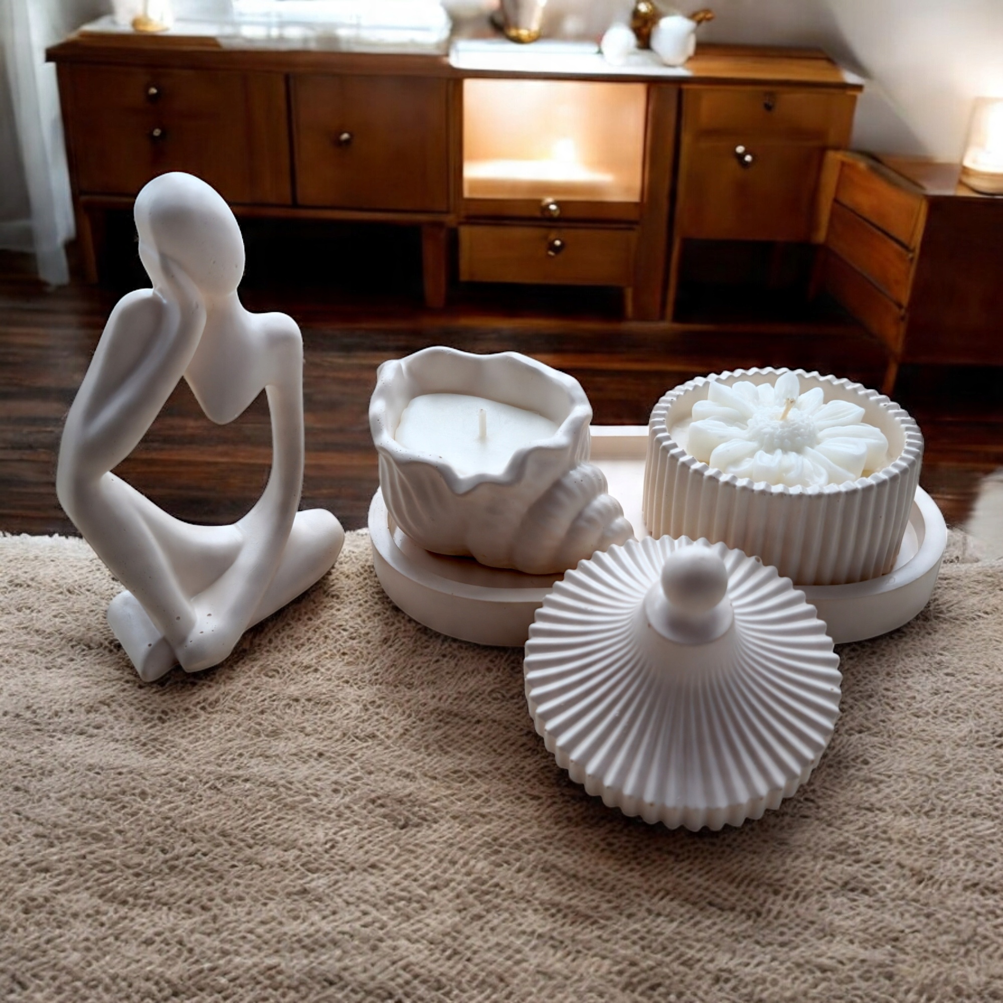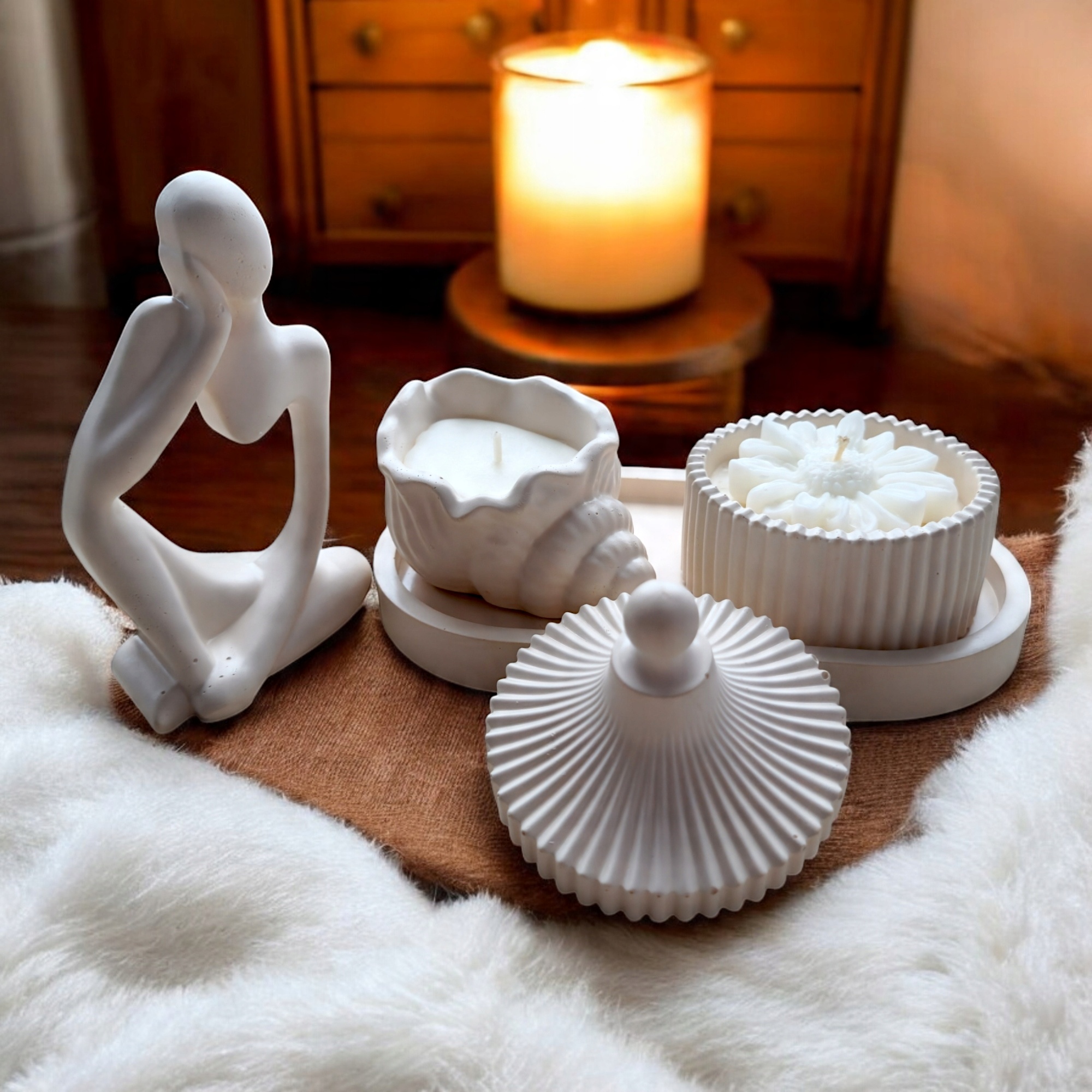 Классическая и элегантная стенда, которая идеально разоблачает свечи и защищает поверхности от тепла. Его минималистский дизайн подходит для любого внутреннего стиля. Фигурация символизирует отражение и мир, идеально смешиваясь с свечами, создавая атмосферу, полную тепла и гармонии. > Элегантная свеча, вдохновленная природой, заключенная в тонкое бежевое блюдо. Его органическая форма вызывает мир прибрежных ландшафтов, а тонкий свет добавляет уюту к интерьеру. Мотив белого ромашки символизирует мир и деликатесу, а элегантный, ребристый сосуд с крышкой позволяет сохранить аромат дольше