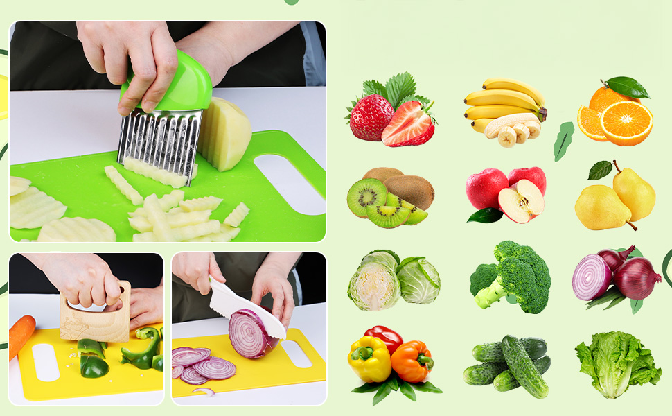 🥑🥑 Безопасность для детей наши ножи для детей не только имеют безопасные материалы, но и безопасное строительство. Набор детских ножей изготовлен из дерева и еды, не -токсичной и BPA без BPA, безопасной для детей. Игрушки для детей старше 3 лет имеют зазубренные края, которые не повредят вашему ребенку. Слайлер для хлеба и овощей для детей имеет конструкцию, которая решает проблему захваченных пальцев