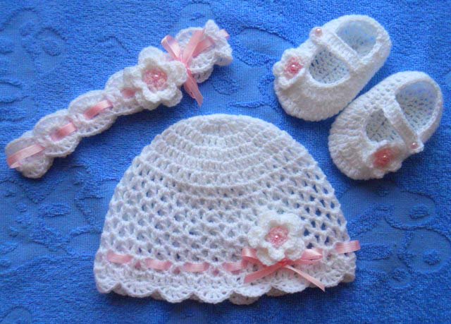 Комплект связан крючком из трех частей: шапка+туфли+повязка на голову, может быть выполнен в любом цвете пряжи и фурнитуры.