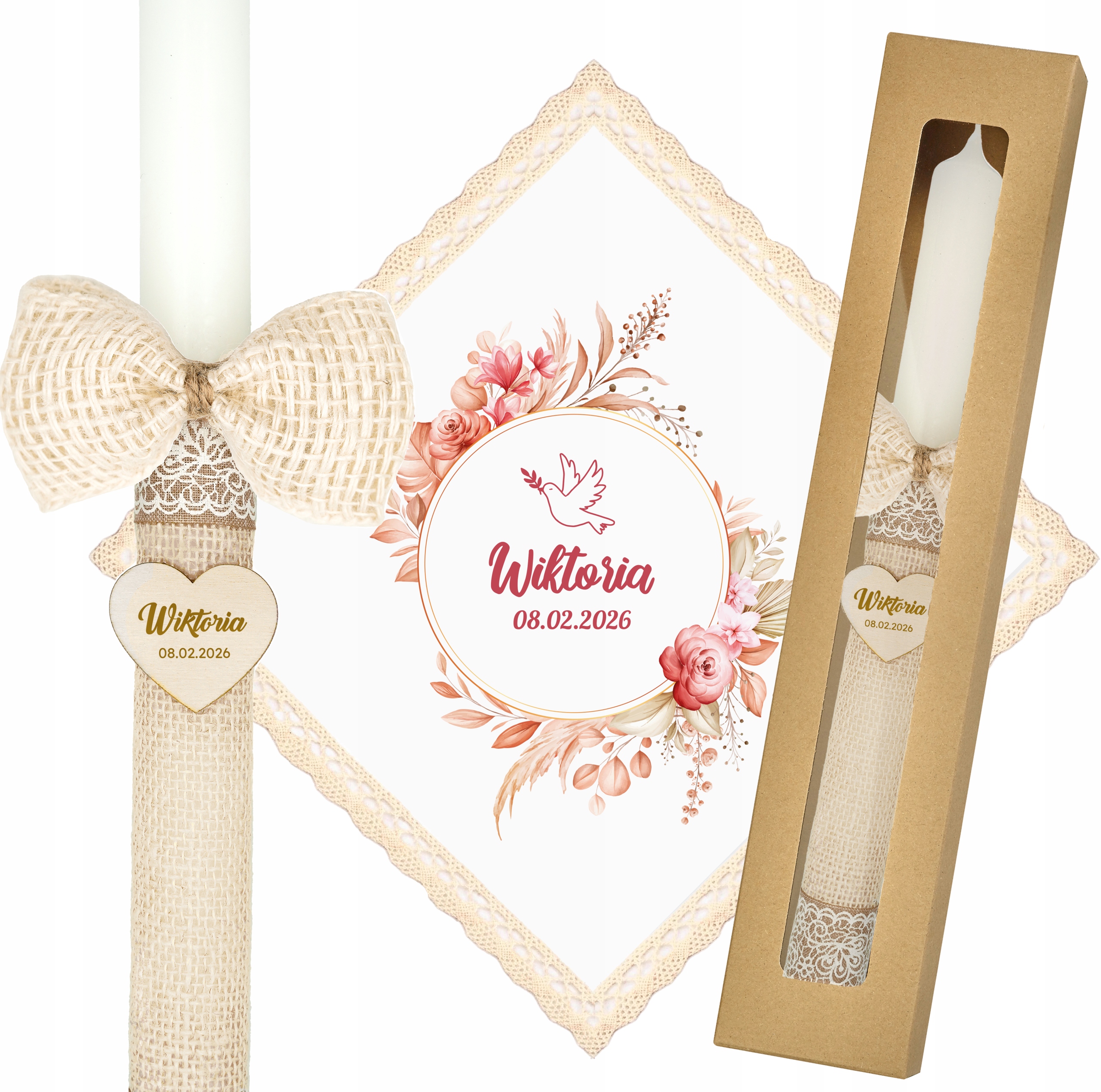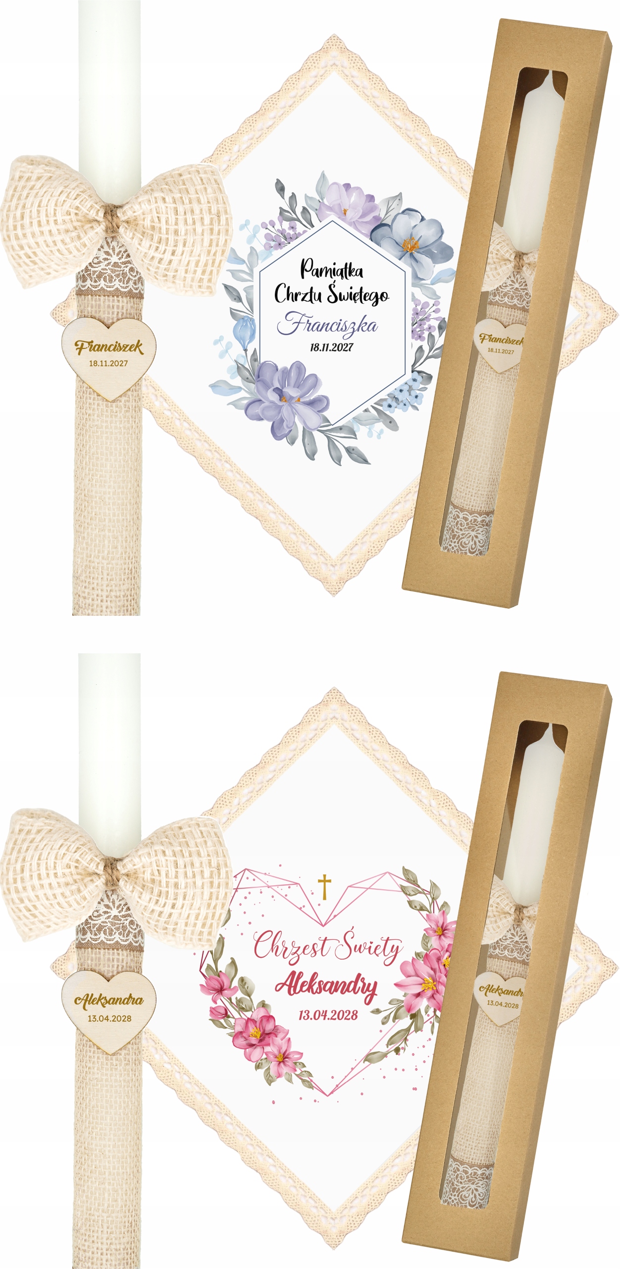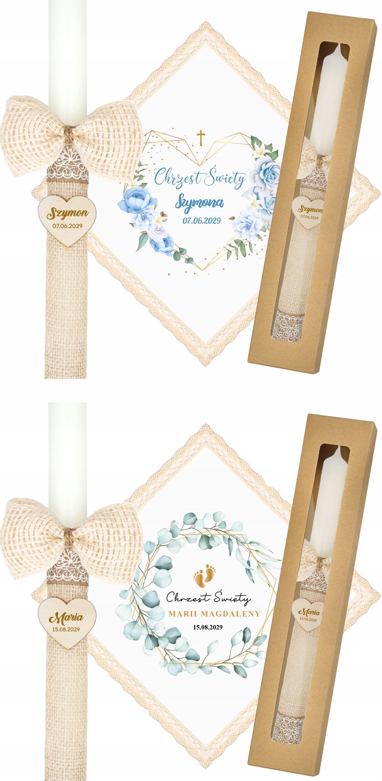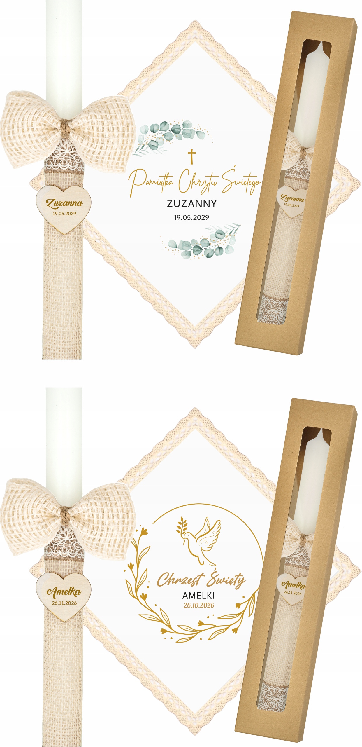 - Свечаиз высококачественного парафина, длина 40см. Элегантно отделано джутовым материалом с декоративными бежевыми лентами с кружевом и красивым джутовым бантом и деревянным сердцем с индивидуальной гравировкой.