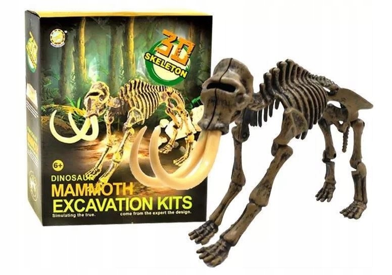 В комплект входит гипсовый блок, в котором спрятан скелет Мамонта, и все инструменты, необходимые для раскопок находки.