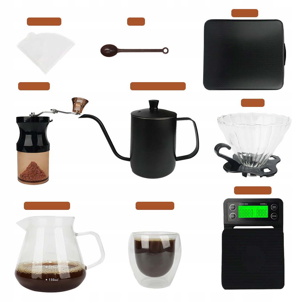 ☕ set содержит 250 мл кофейную чашку, 600 мл стеклянного кувшина, 600 мл ручного пивоваренного кувшина, 150 мл измельчительной, 40 листов фильтрованной бумаги, фильтровая чашка, электронная шкала, ложка и ящик для хранения. У него есть все, что вам нужно.