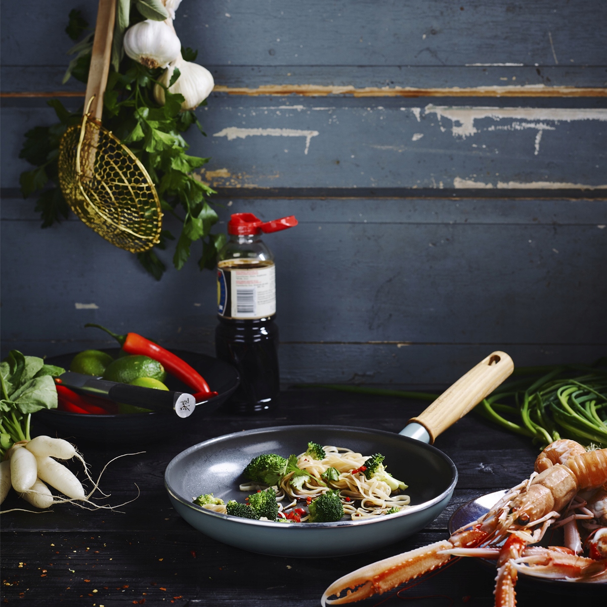 Магнитовая технология - дно сковороды изготовлена из алюминия, насыщенного ферромагнитными частицами, благодаря которой возможно индукционное явление - и сковорода нагревается, несмотря на отсутствие стали. Дно сковороды дополнительно уточняется дисперсными медными частицами. Генерируемое тепло распределяется равномерно, а дно сковороды гораздо менее подвержен деформации. Его можно использовать на всех нагревательных пластинах (также индукция). Не используйте на духах. Сделано без ПФОА, не содержит свинца или кадмия. Файл вручную.