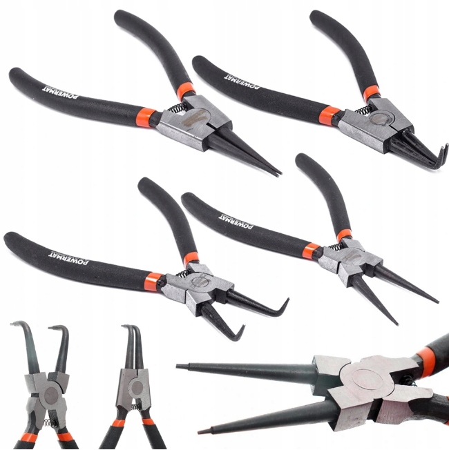 Щипцы используются для сборки и демонтажа стопорных колец Зегера. Имеется 2 вида защиты: внутренняя (расширяющаяся внутри втулки) и внешняя (прижимная, снаружи вала). Весь комплект адаптирован для работы с наружными и внутренними кольцами. Они имеют прямые и изогнутые концы. Клещи изготовлены из прочной и долговечной хромованадиевой CrV стали и имеют двухцветные резиновые ручки. Покрыт прочным никелевым покрытием.