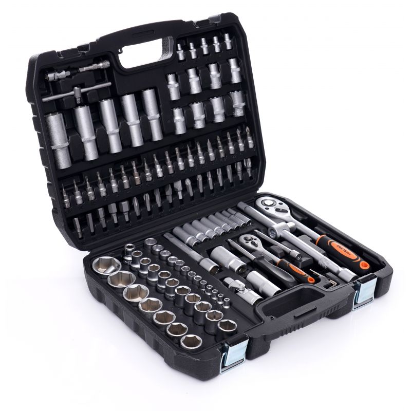 - Инструменты характеризуются солидным рабочим мастерством, прочным материалами и удобным чемоданом, в котором каждый инструмент имеет свое место. Chrome-Vanadium Steel (CRV), предназначенная для инструментов мастерской. Предзнаменовано