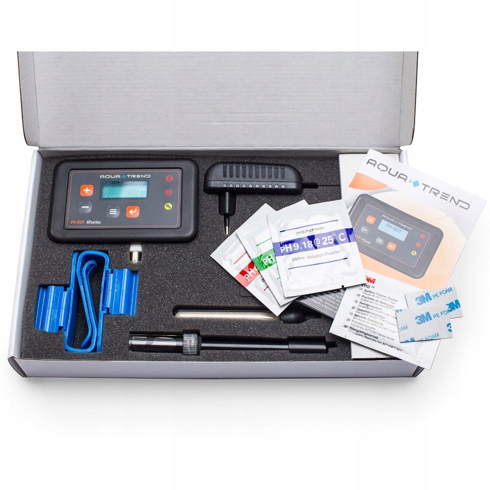 В упаковке Aqua Trend PH Maxi есть: элементы, необходимые для подключения, руководство пользователя, питания сети, PH -зонд, калибровочные буферы pH, датчик температуры, соленоидный клапан CO2, крепежная лента. Размеры устройства составляют 122 x 78 x 27 мм.