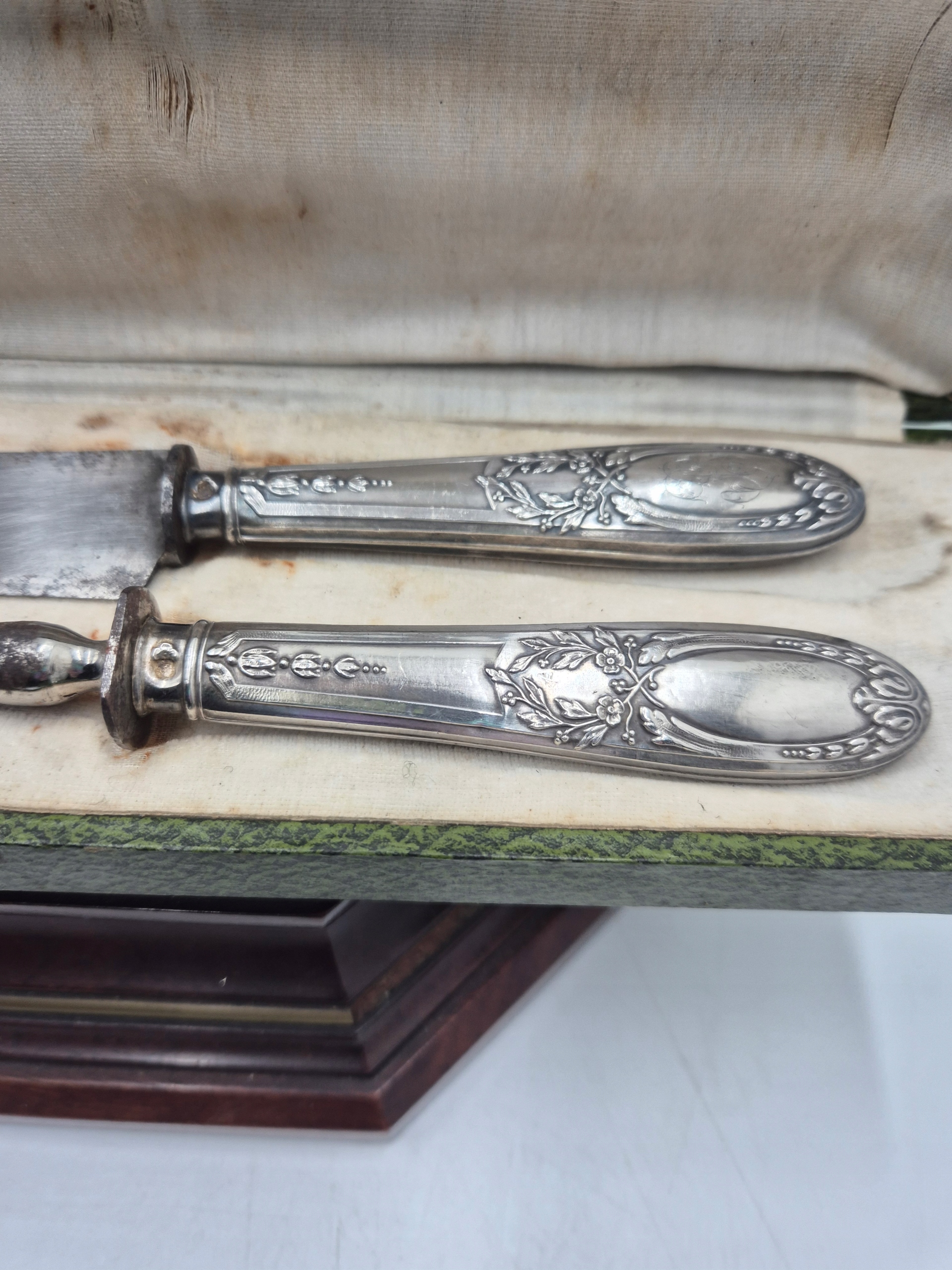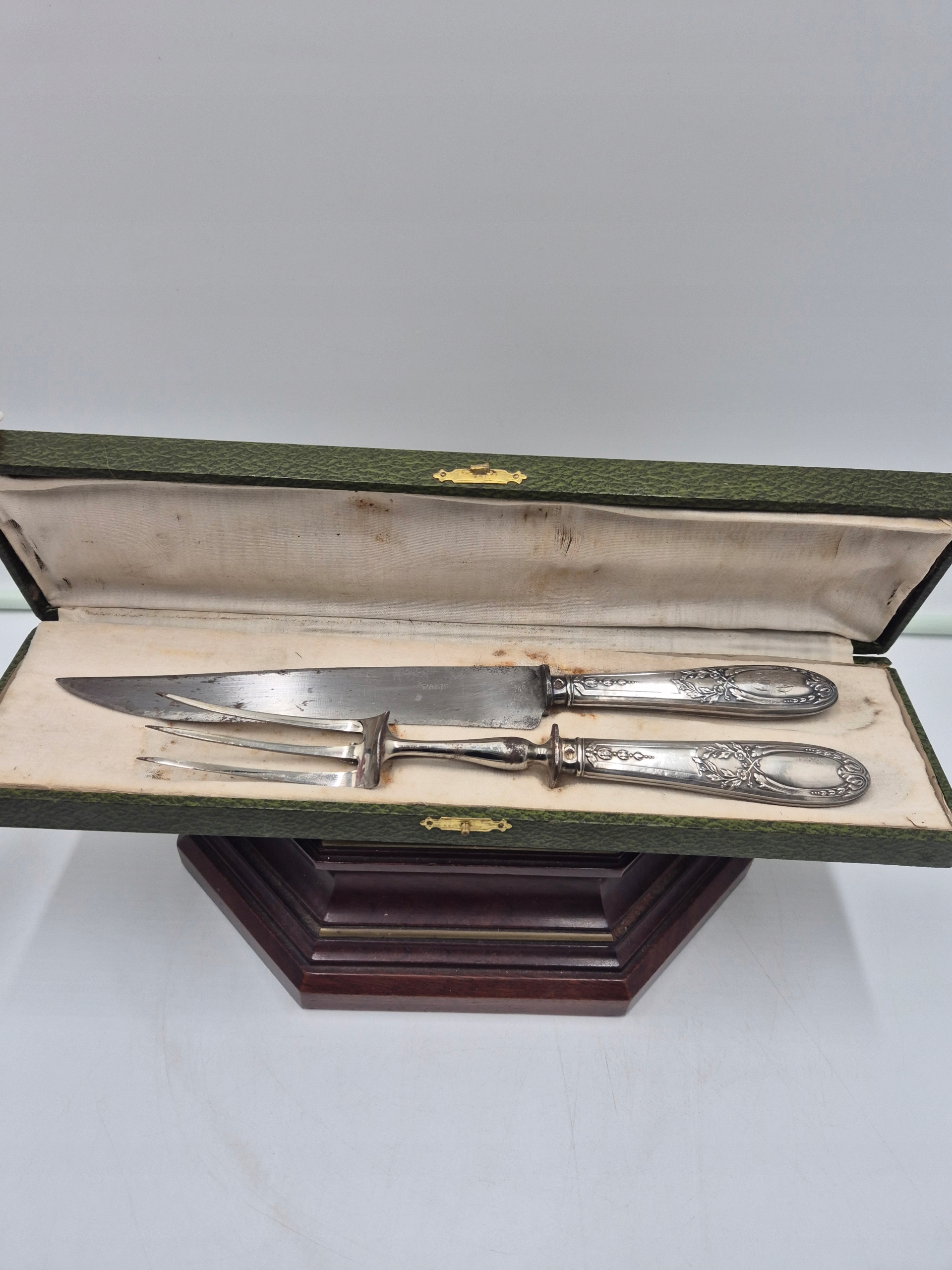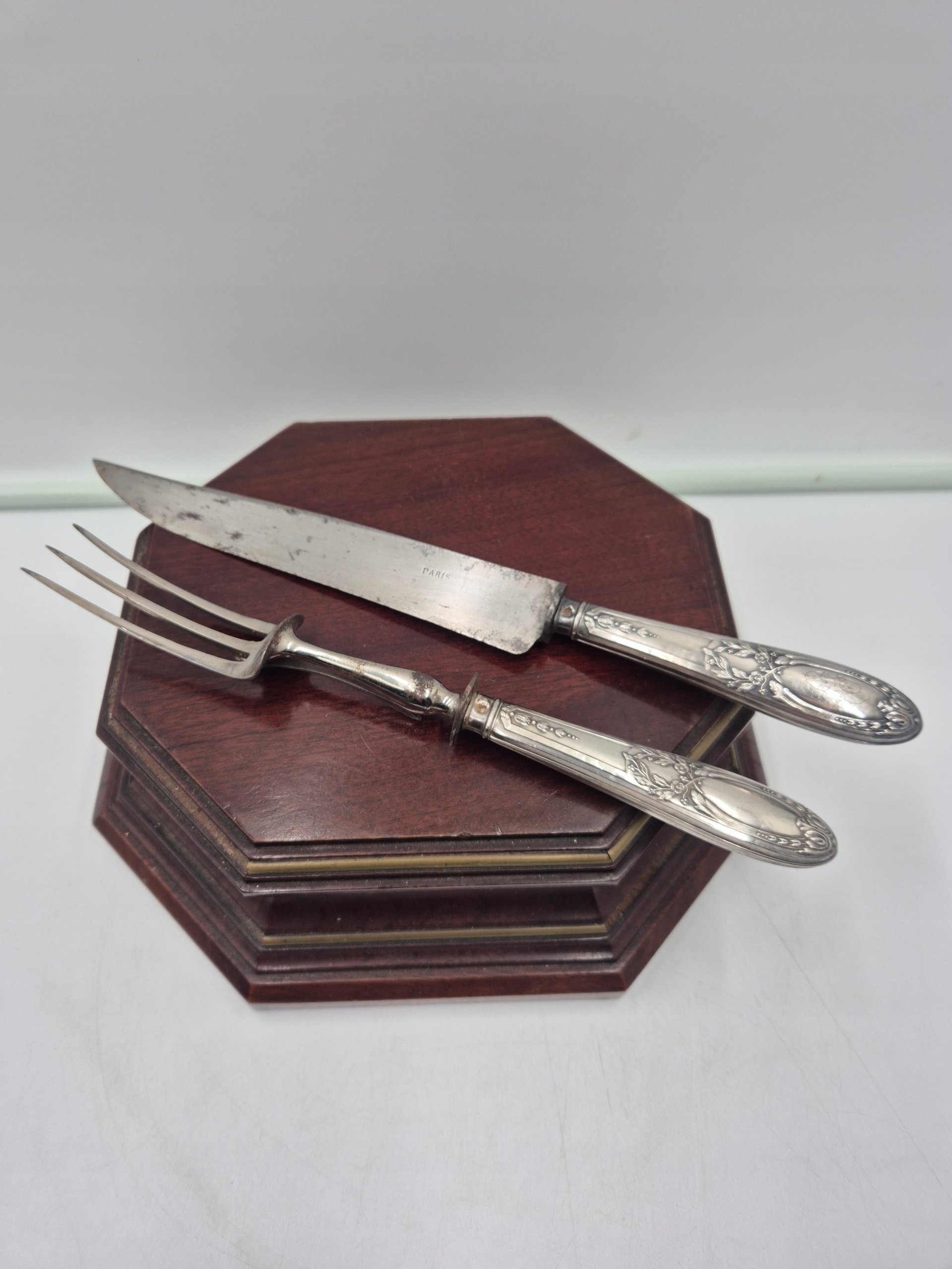 Тема аукциона - историческая пара твердых столовых приборов для резки мяса.