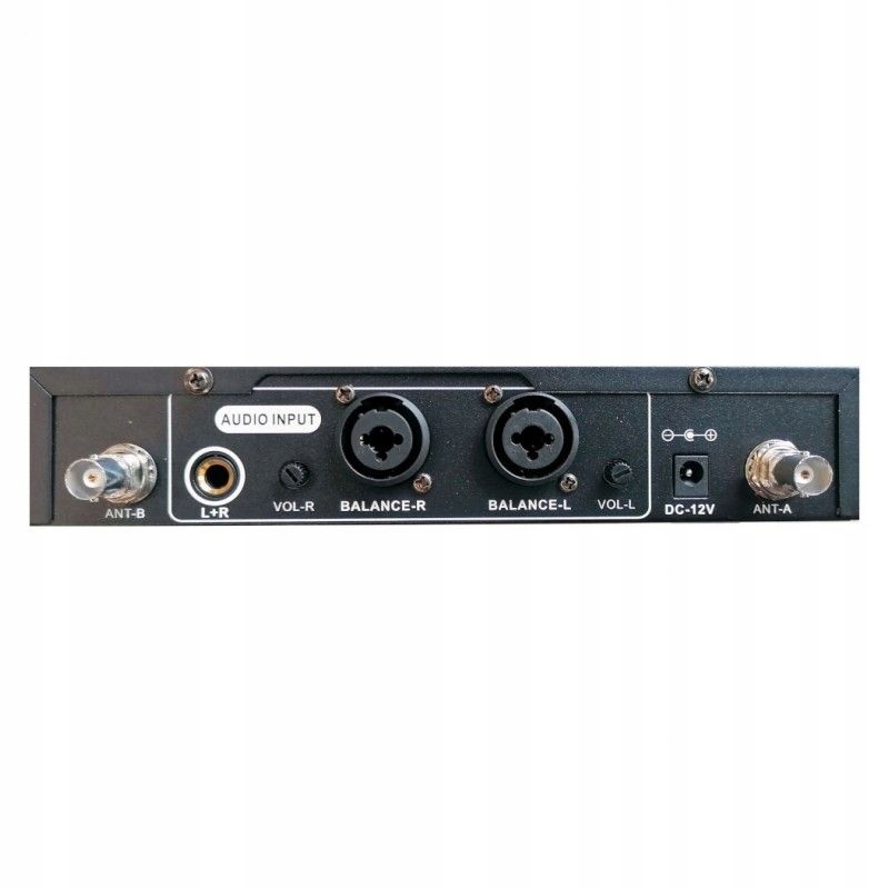 Вторая часть системы - это радиоволновый передатчик с частотным диапазоном от 518 до 542 МГц. На задней части корпуса есть два комбинированных входа - xlr/разъем для левого (L) и правого (R) канала с вращающимися потенциометрами объема, входом стереотезита (6,3 мм), гнездам для соединения источника питания (включены) и двух разъемов антенны BNC. В передней части расположена пищевая переключатель, два разъема для наушников с потенциометрами громкости и панель управления, оснащенная вверх, вниз, установлен и прозрачный ЖК -дисплей. Он показывает текущие параметры системы мониторинга звука, такие как качество сигнала, установка установленной частоты или выбранного канала передачи данных.