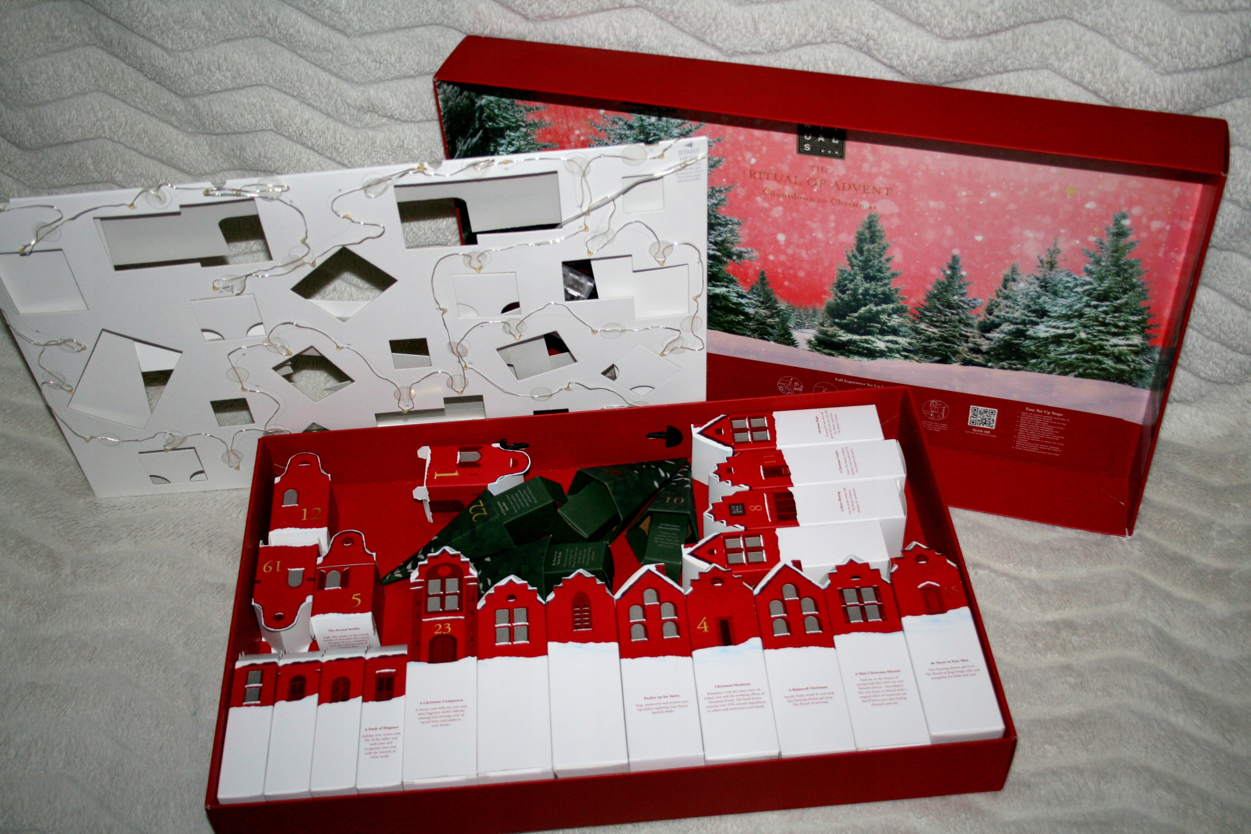 • пронумерованные коробки в форме домов и рождественских елок создают красивый рождественский город.