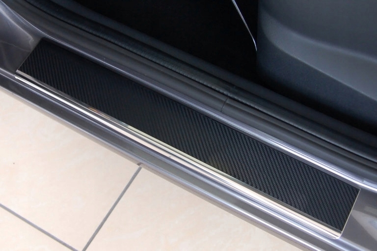 Накладки на пороги из полированной нержавеющей стали + карбоновая фольга, с загибом кромки. Мы гарантируем идеальное соответствие профилю порога.