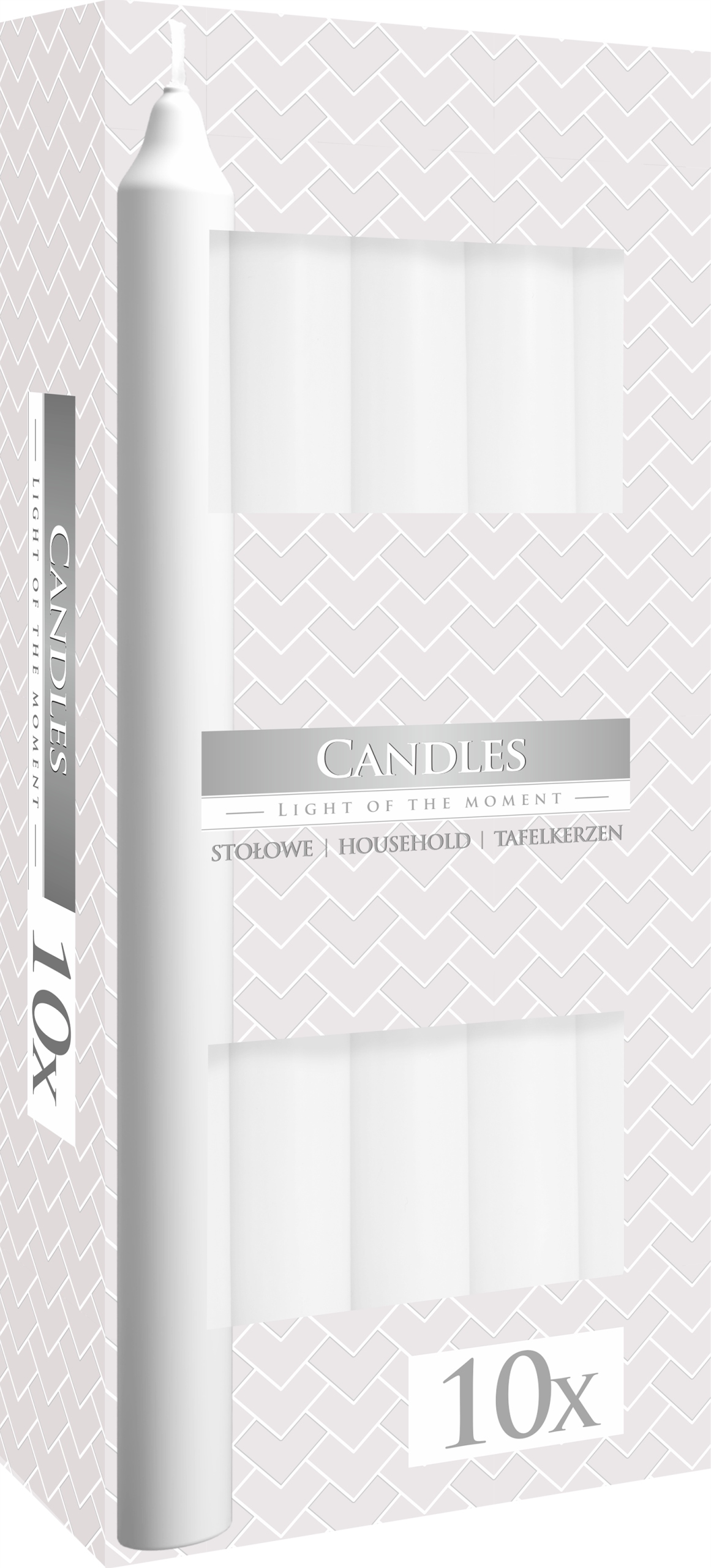 Свеча настольная декоративная формы цилиндра, без капель, без запаха, высота 23,5 см , диаметр 2 см и время горения до 7 часов БИСПОЛ. Упакованы по 10 штук в сборную упаковку.