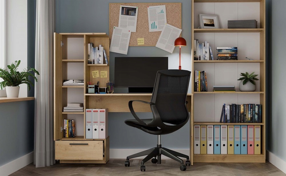 - Встроенный книжный шкаф с дверцами - 4 полки со скрытыми дверцами для документов, канцелярских товаров или менее эстетичных элементов.