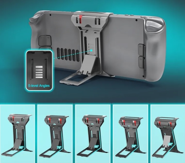 Держатель также выполняет роль устойчивой подставки с регулируемым углом наклона, благодаря чему мы можем разместить консоль на столе или в любом другом месте.
