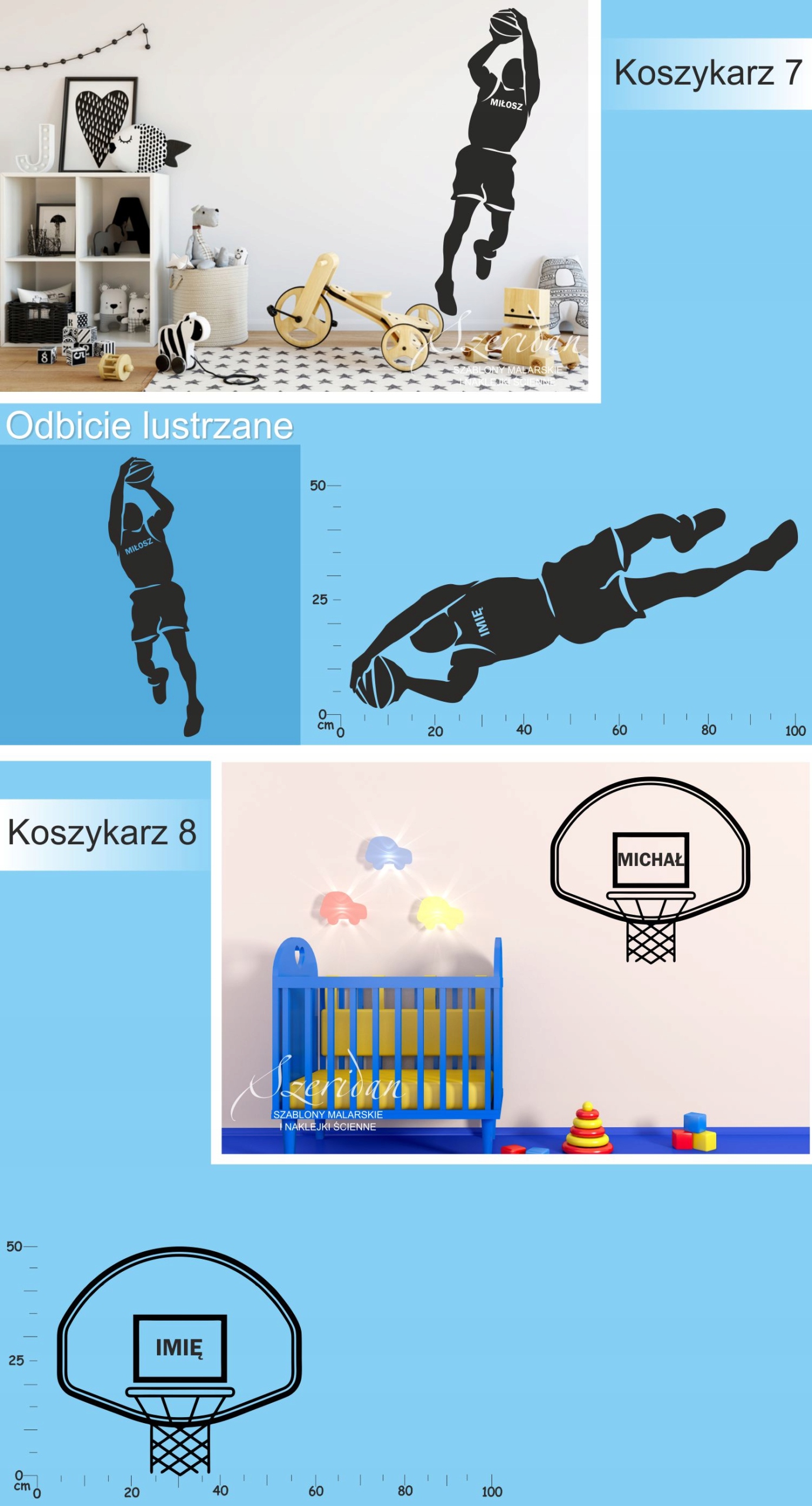 Наклейки на стенах, футболисты, баскетболисты с названием, расположенным на листе 100x50 см, точное измерение наклеек отображается на графике с каждым рисунком.