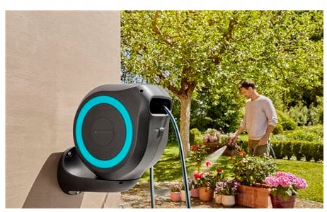 Если вы слегка потянете за конец шланга, активируется встроенная стальная пружина, которая автоматически и надежно втягивает шланг. Технология RollControl обеспечивает медленную и безопасную смотку, независимо от того, насколько далеко размотан шланг.