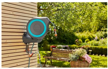 Настенная катушка RollUp M включает в себя настенное крепление, 20 метров садового шланга, соединительный шланг, все необходимые компоненты оригинальной системы GARDENA и разбрызгиватель с двумя режимами струи воды.