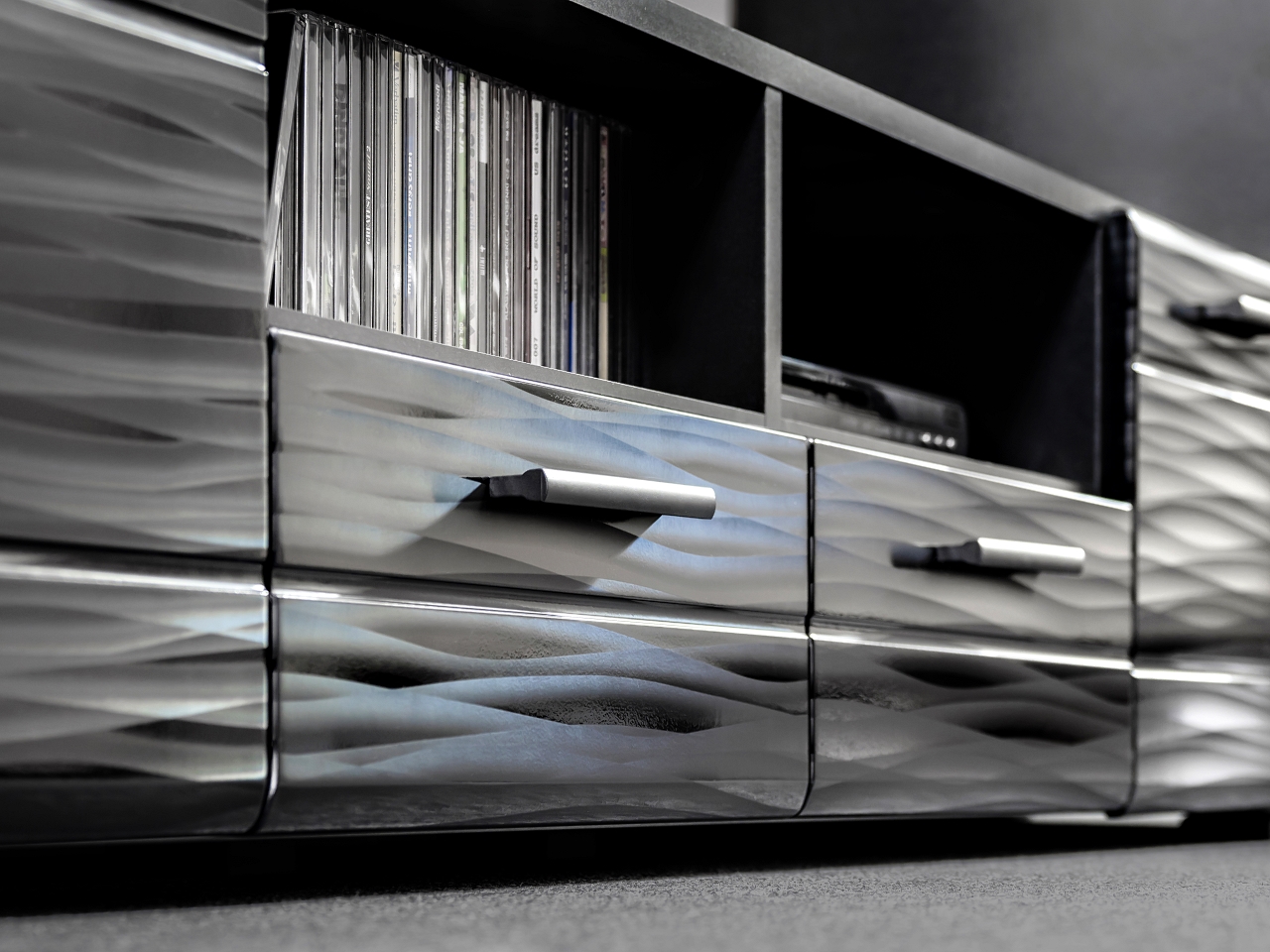 Современный настенный блок modica из производителя польской мебели furniva l - олицетворение инновационного стиля и функциональной формы твердых тел. Предложение рассматривается любителям смелого стиля и инновационного дизайна. Набор имеет характерный декор фронтов с эффектом 3D и освещением типами RGB стеклянных полков. Черные матовые тела идеально адаптируются с мерцающими фронтами сахары. настенный блок Modica в течение длительного времени порадует как гостей, так и самого домохозяйства.