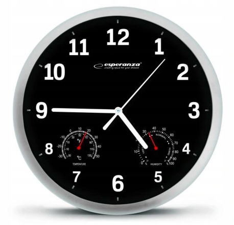 Наши настенные часы Esperanza WASHINGTON используются не только для отображения времени — на них также можно считывать температуру и влажность окружающей среды.