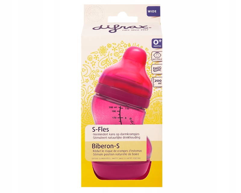 бутылочная дифракс S-baby Wide 200 мл была самой популярной бутылкой для детей в течение многих лет, матерей и пап благодаря уникальному антиколонному клапану и бутылке в форме буквы S. Комбинация этих двух особых особенностей гарантирует фиксированный и обычный поток еды без прокалывания молока по ребенку. Антиколевая бутылка S-BAB может использоваться с рождения и является проверенной комбинацией с грудным вскармливанием. Это также очень хорошо подходит для молочных капотов.