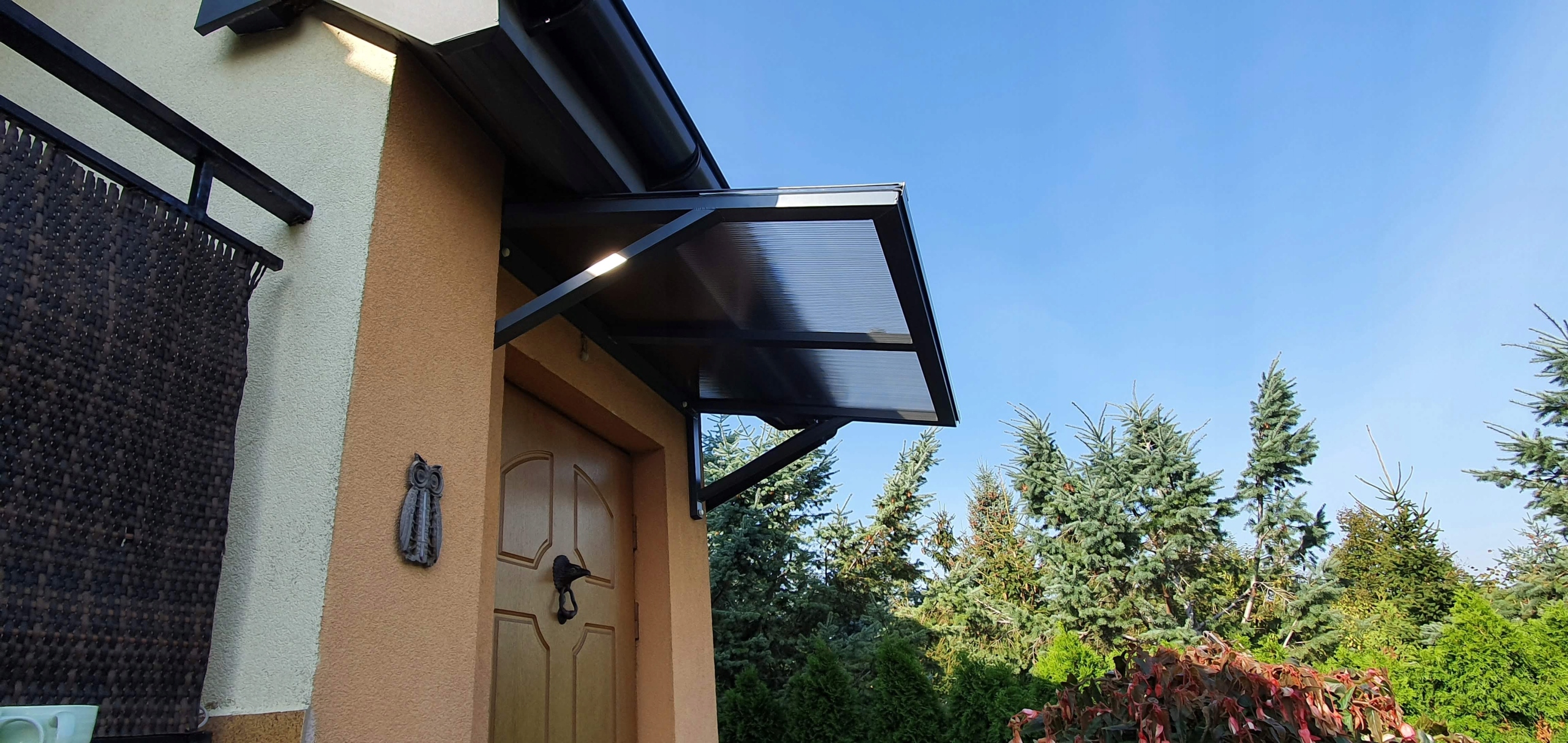 Крыша, навес над дверью, размеры 200х100см, на алюминиевом каркасе, порошковая окраска в любой цвет по палитре RAL, заполнение: сотовый поликарбонат толщиной 10 мм, цвет на выбор: дымчатый, бесцветный или молочный.