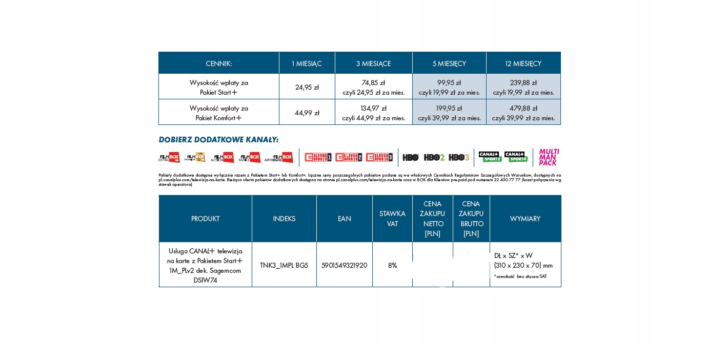 Просматривая «NC Card TV + без контракта карта 1M CANAL + », вы можете быть уверены, что данный товар из каталога «Тюнеры» будет доставлен из Польши и проверен на целостность. В цене товара, указанной на сайте, учтена доставка из Польши. Внимание!!! Товары для Евросоюза, согласно законодательству стран Евросоюза, могут отличаться упаковкой или наполнением.