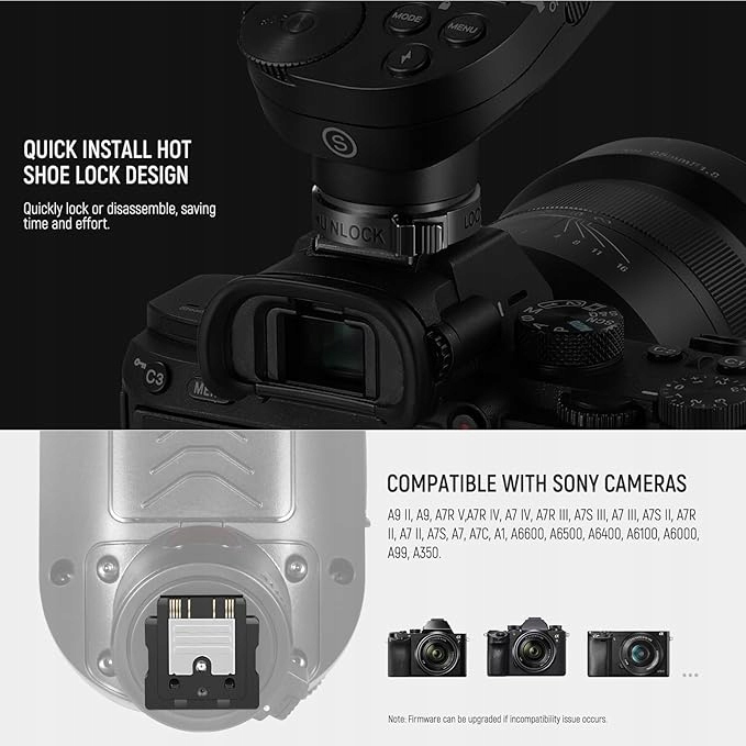 Широкая совместимость: QPRO-S Flash-триггер может быть быстро прикреплен к камере с металлической горячей ногой. Совместим с Sony A9 II A9 A7R V A7R IV A7 IV A7R III A7S III A7 III A7S II A7R II A7 II A7S A7 A7C A1 A6600 A6500 A6400 A6100 A6000 A99 A35500. /p>