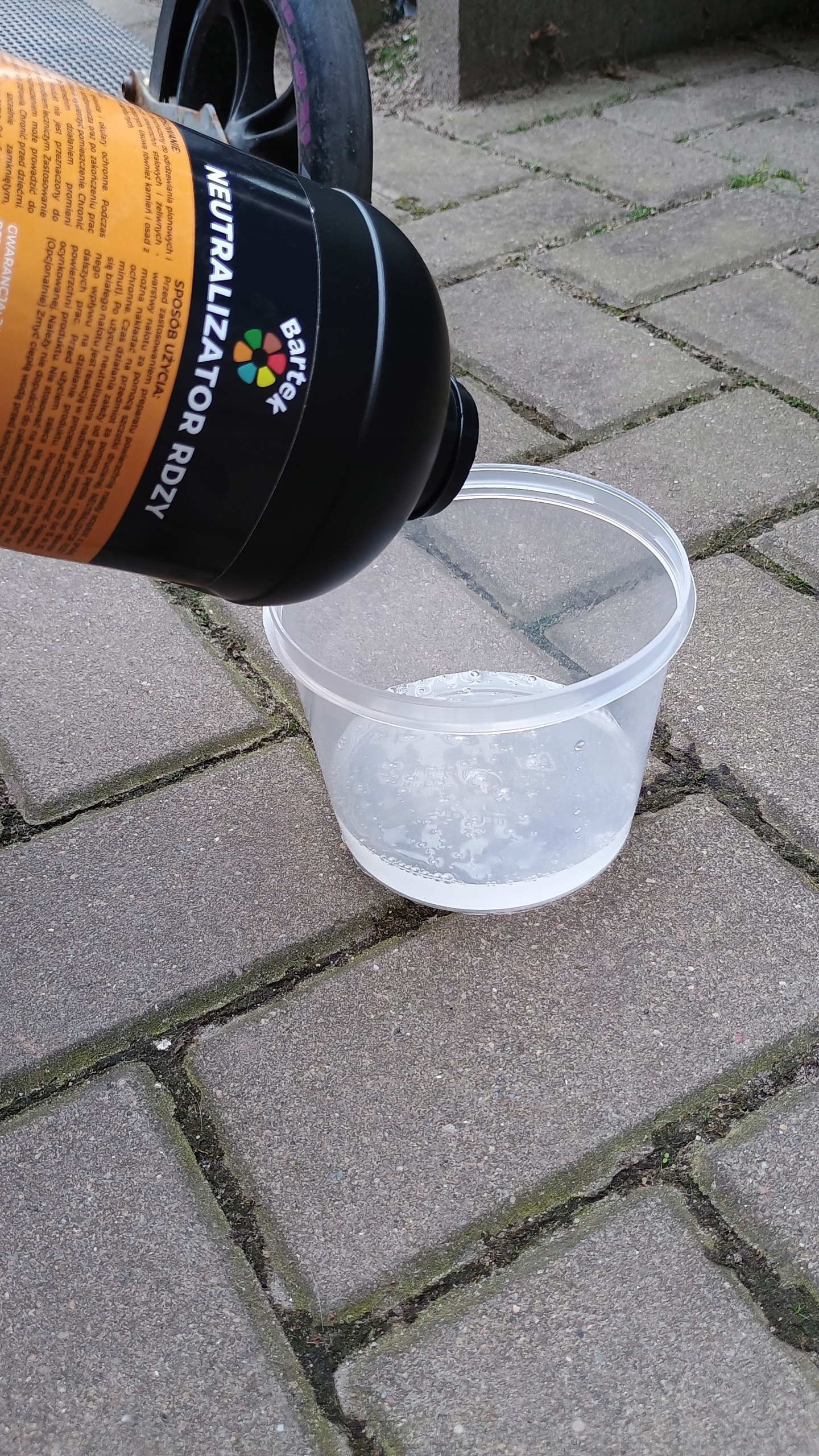 1. Ржавые предметы с толстым слоем ржавчины следует предварительно очистить проволочной щеткой, а затем щеткой или хлопчатобумажной тканью (в защитных перчатках) нанести на заржавевший элемент средство для удаления ржавчины; оставьте средство для удаления ржавчины минимум на 15-30 минут или дольше. После нанесения могут остаться отложения – удалите их, тщательно промыв теплой водой. В случае сильного загрязнения операции следует повторить.