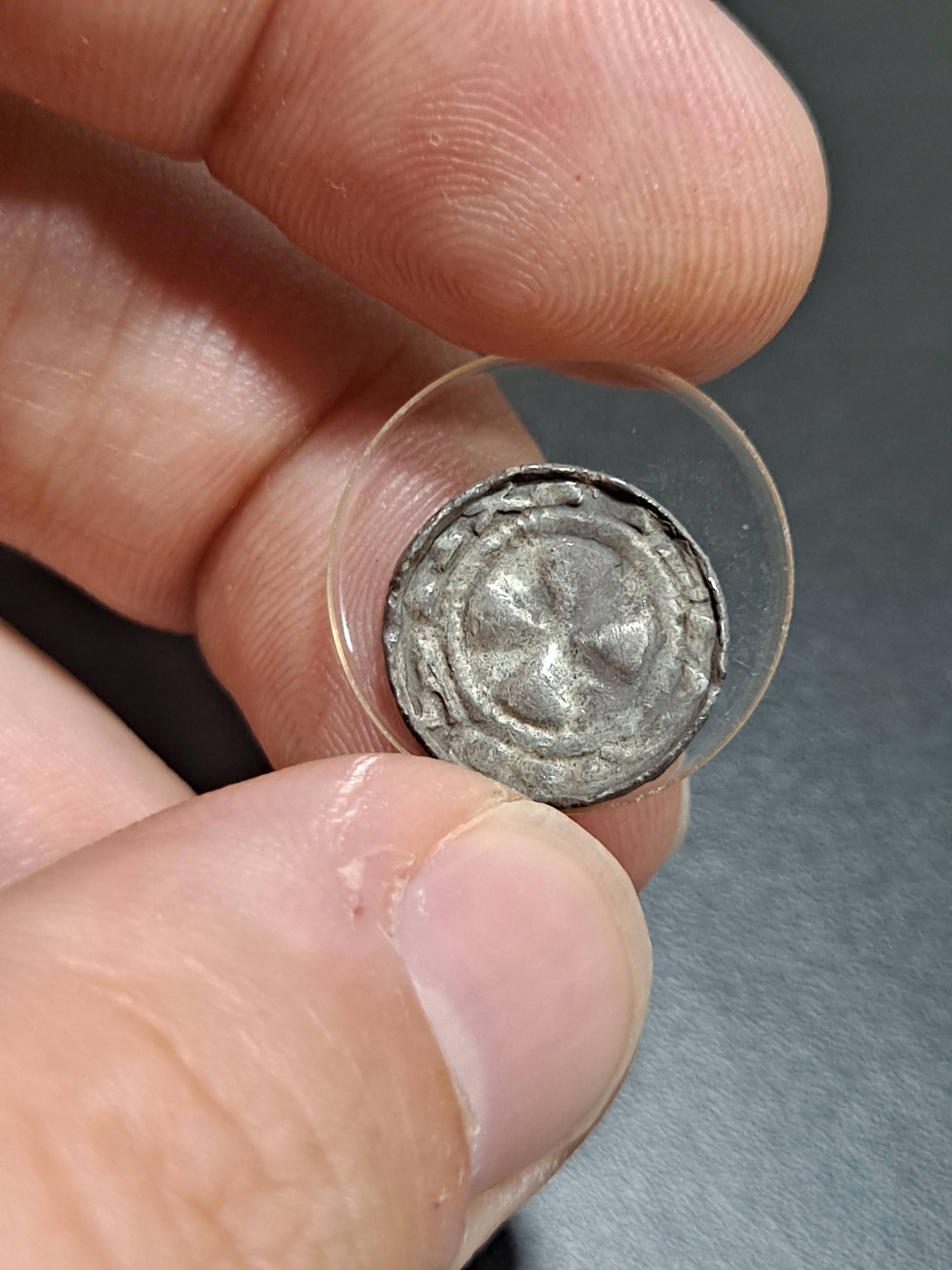 Литература: CNP, тип V. Разнообразие с жемчужным крестом (?). 12 жемчужины, в углах рук холостяка Креста попеременно мяч и мяч под треугольной, слегка округлой аркой. В ободе псевдолелегенда.