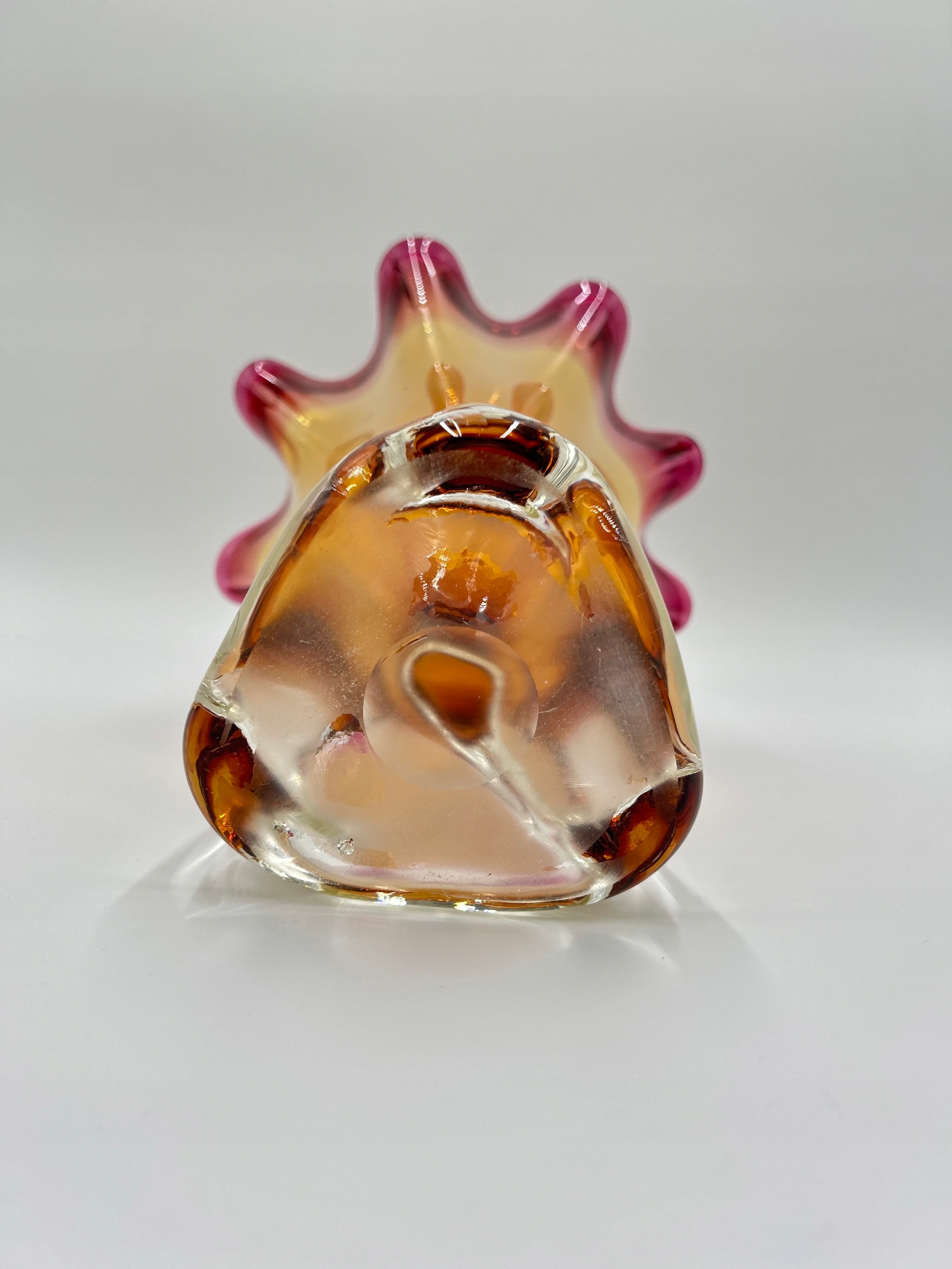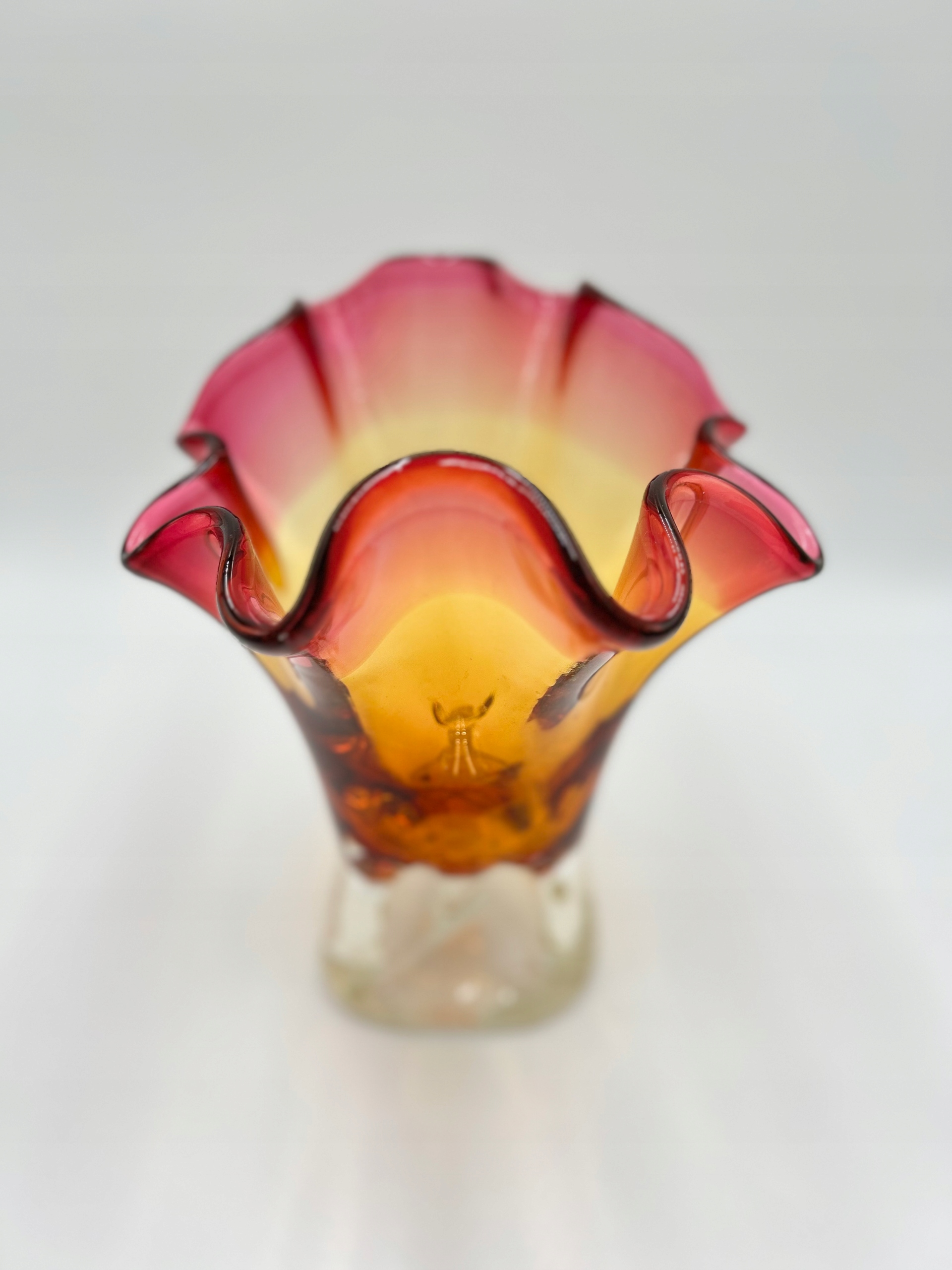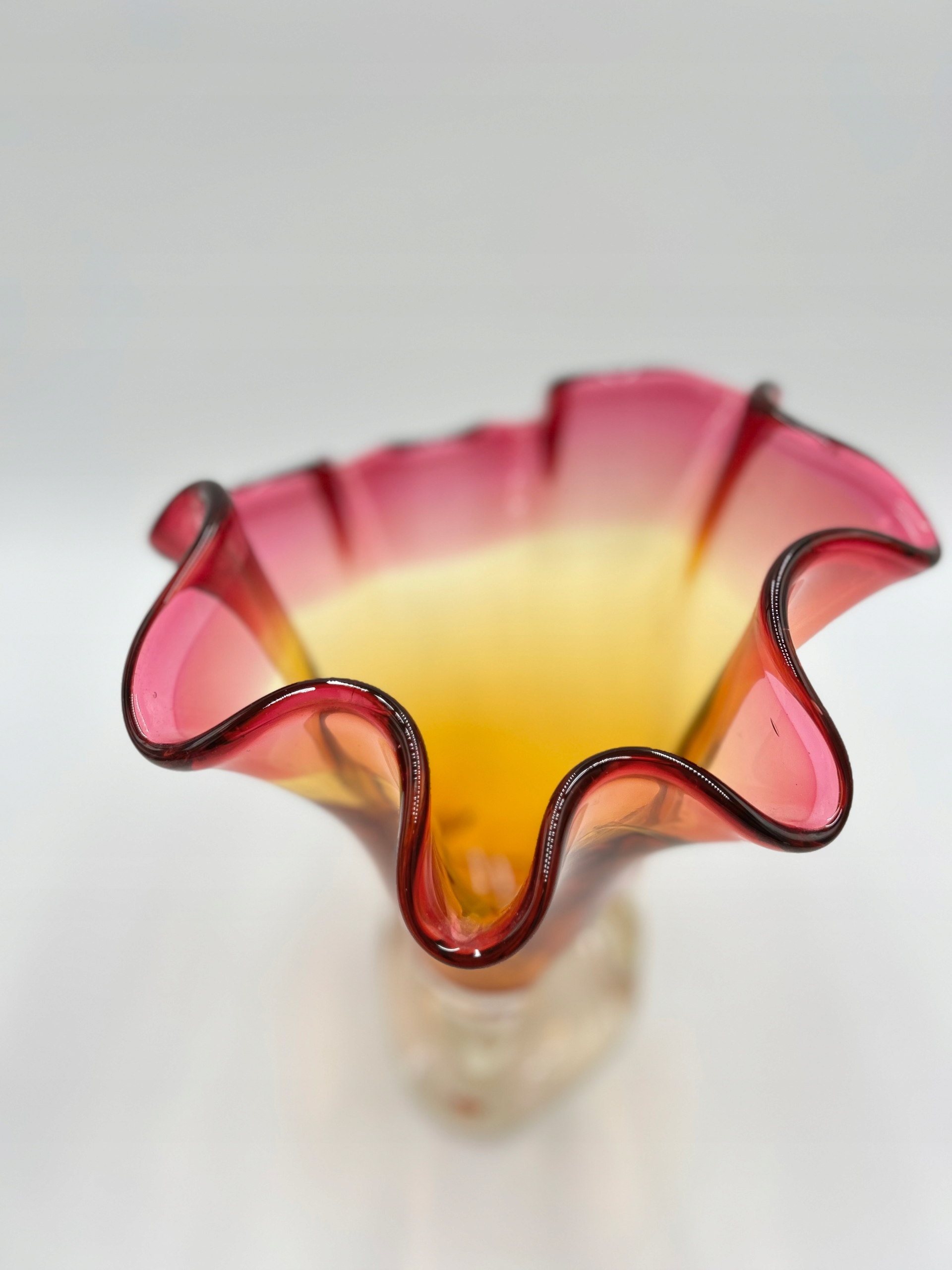 Тема продажи - это уникальная ваза в янтаре и апельсине с Fuchsia Frill, с прозрачной основой.