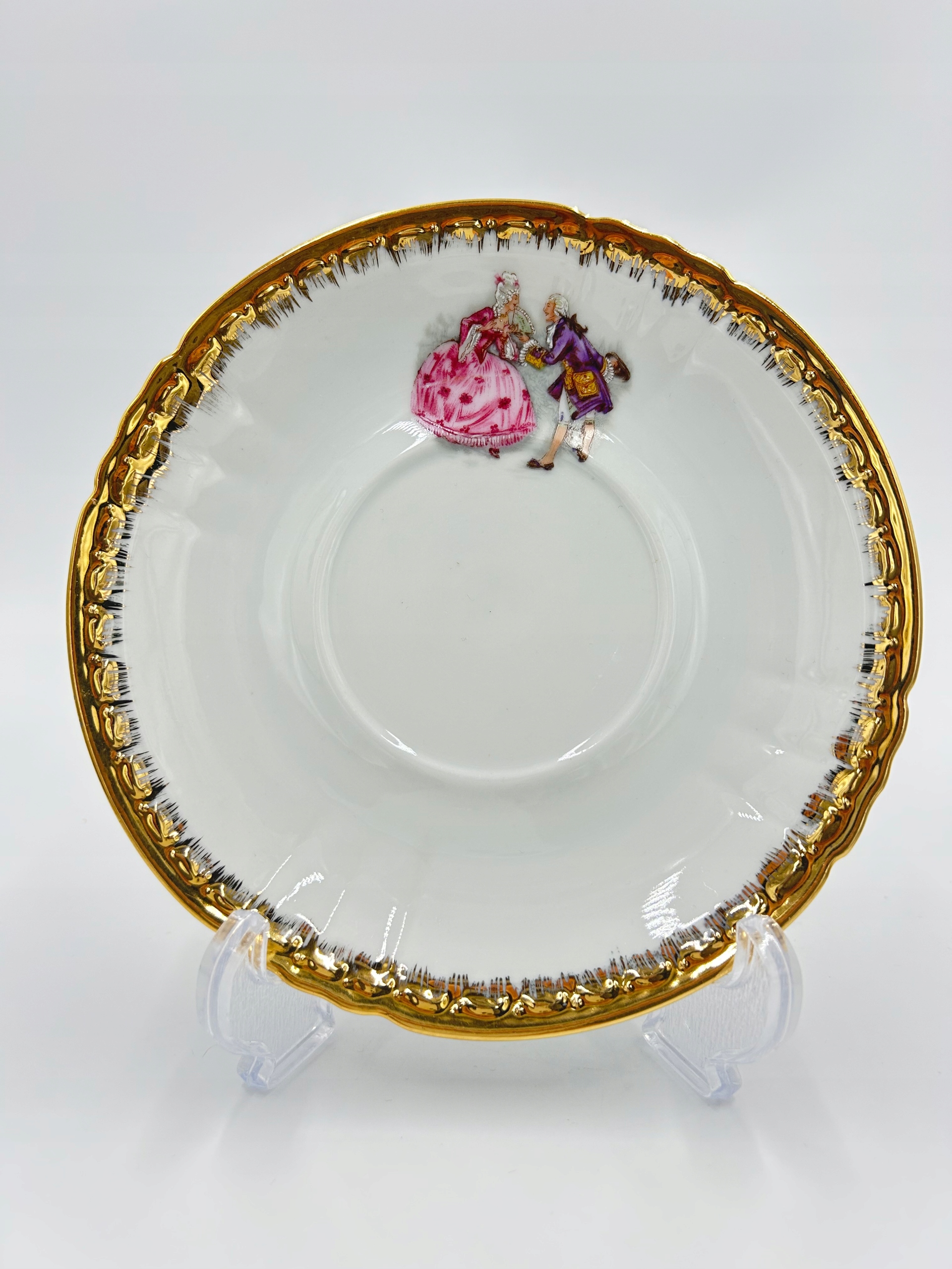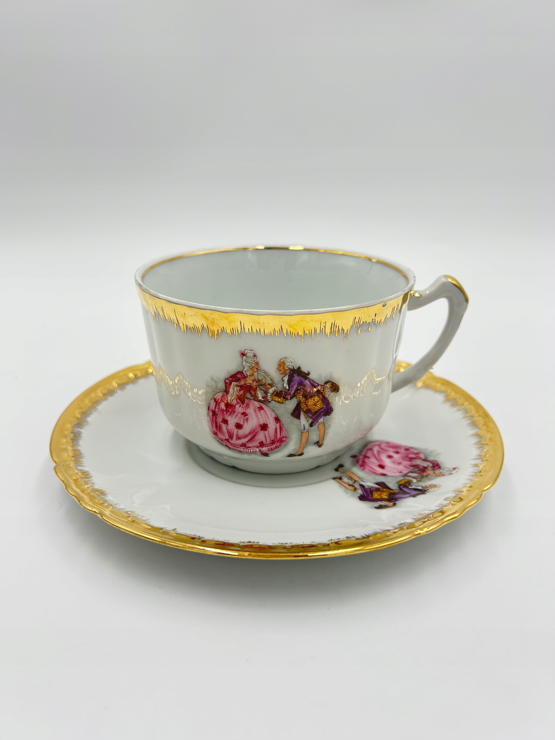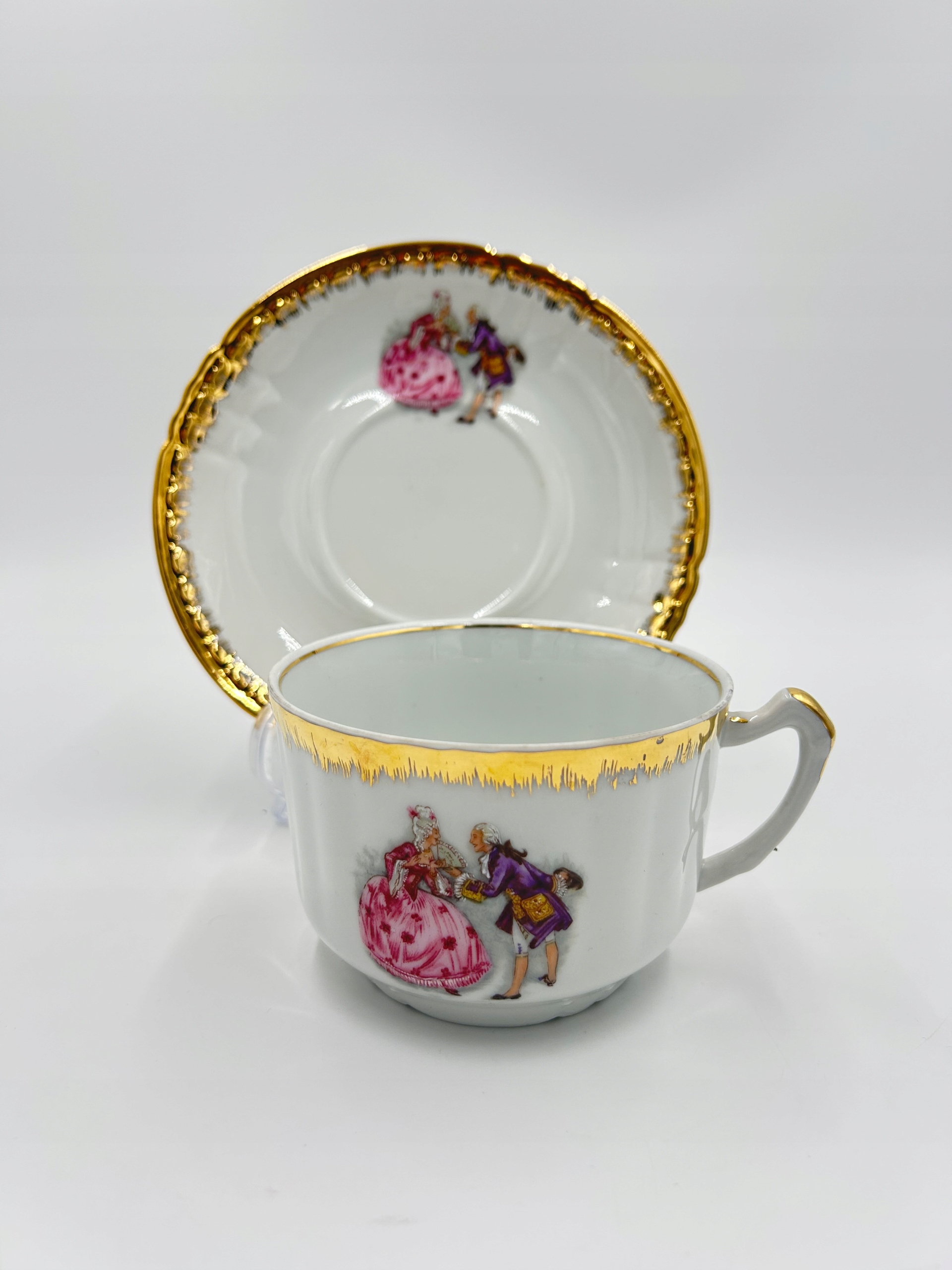 Большая чайная чашка, сделанная из белого фарфора, украшенная любовной сценой, края судов богато украшены. Подписанный.