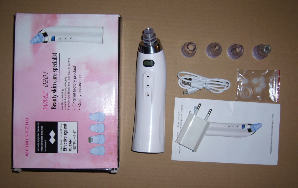 В комплект входят: портативное устройство с аккумулятором, 4 сменных насадки, USB-кабель, блок питания, 5 губчатых фильтров, 2 уплотнителя, инструкция на английском языке, оригинальная упаковка.