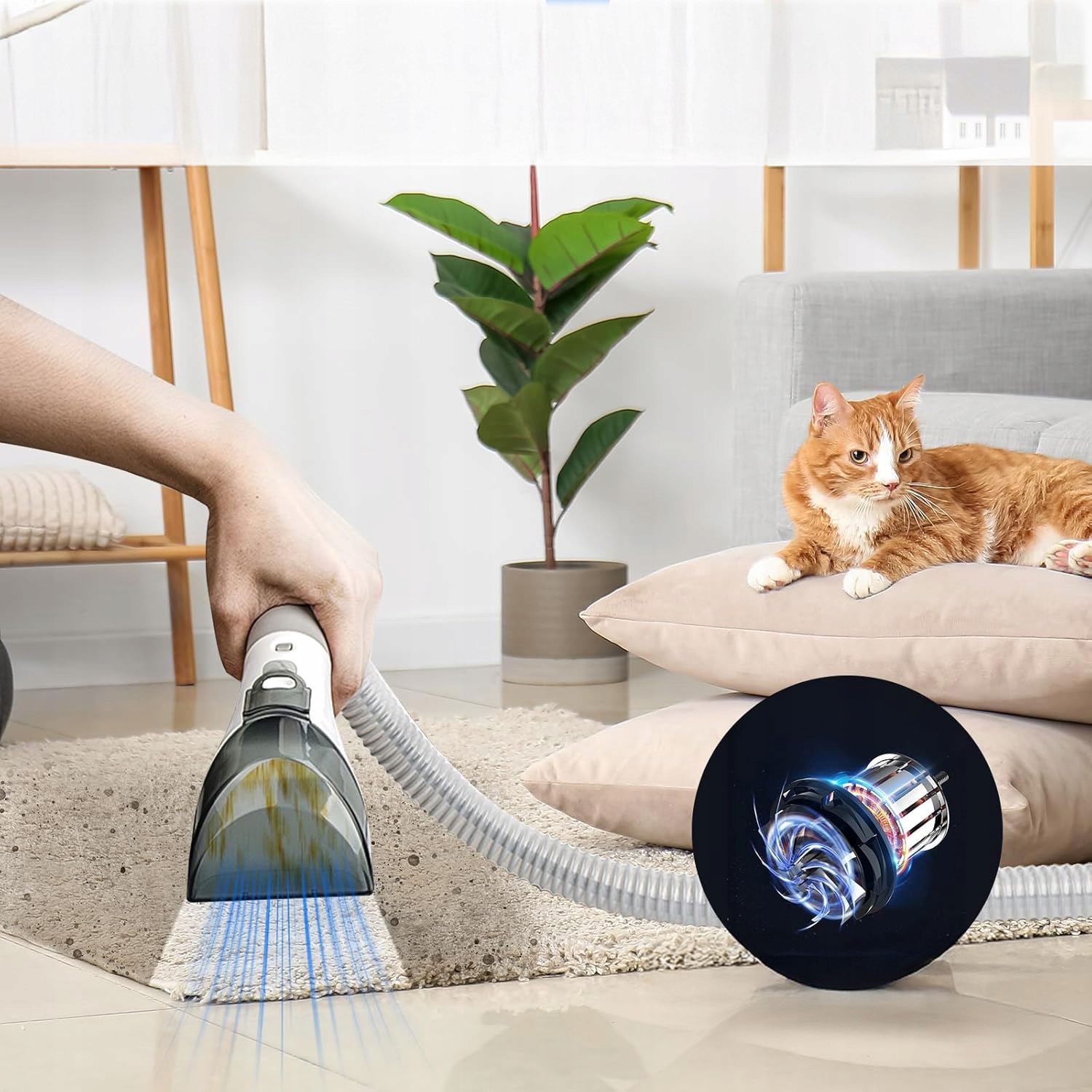 Устройство очистки ковров оснащено двигателем 450 Вт, которое обеспечивает высокую мощность всасывания. Наш обителей обивки быстро и точно устраняет постоянные запахи, различные виды пятен и грязь, такие как грязь, вино, помещение для животных и другие, из ковров и обивки. Его можно использовать на ковриках, лестнице, обивке, диванах, автомобильных интерьерах и многом другом. Это быстро удалит пролитые жидкости и придаст вашему дому новый вид.