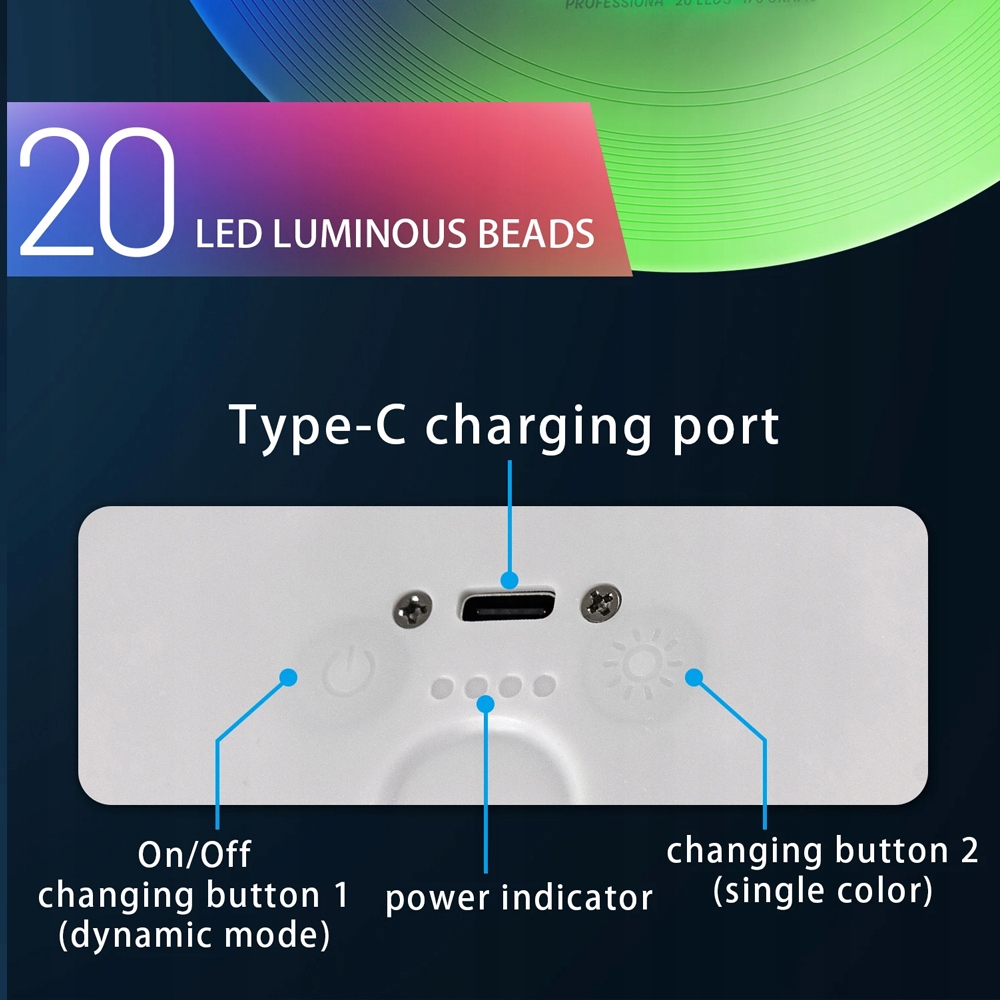 4-часовое срок службы батареи: камера аккумулятора имеет зарядный порт C. После полной зарядки фрисби вы можете использовать в течение 4 часов. Борьба с подсветкой Frisbee является водонепроницаемой и может быть промыт напрямую. Однако не погружайте его в воду, чтобы избежать повреждений.